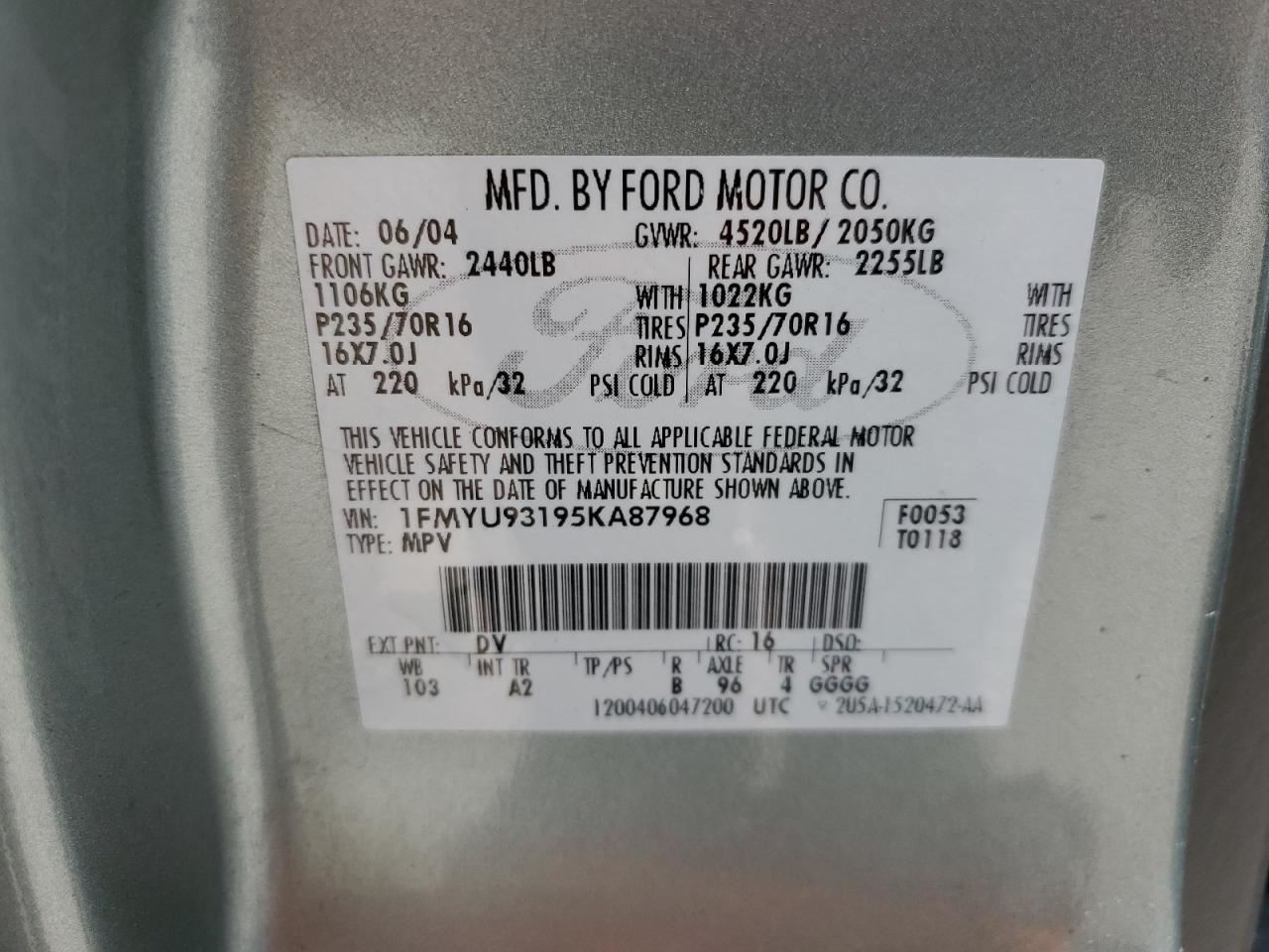 - VIN #: 1FMYU93195KA87968