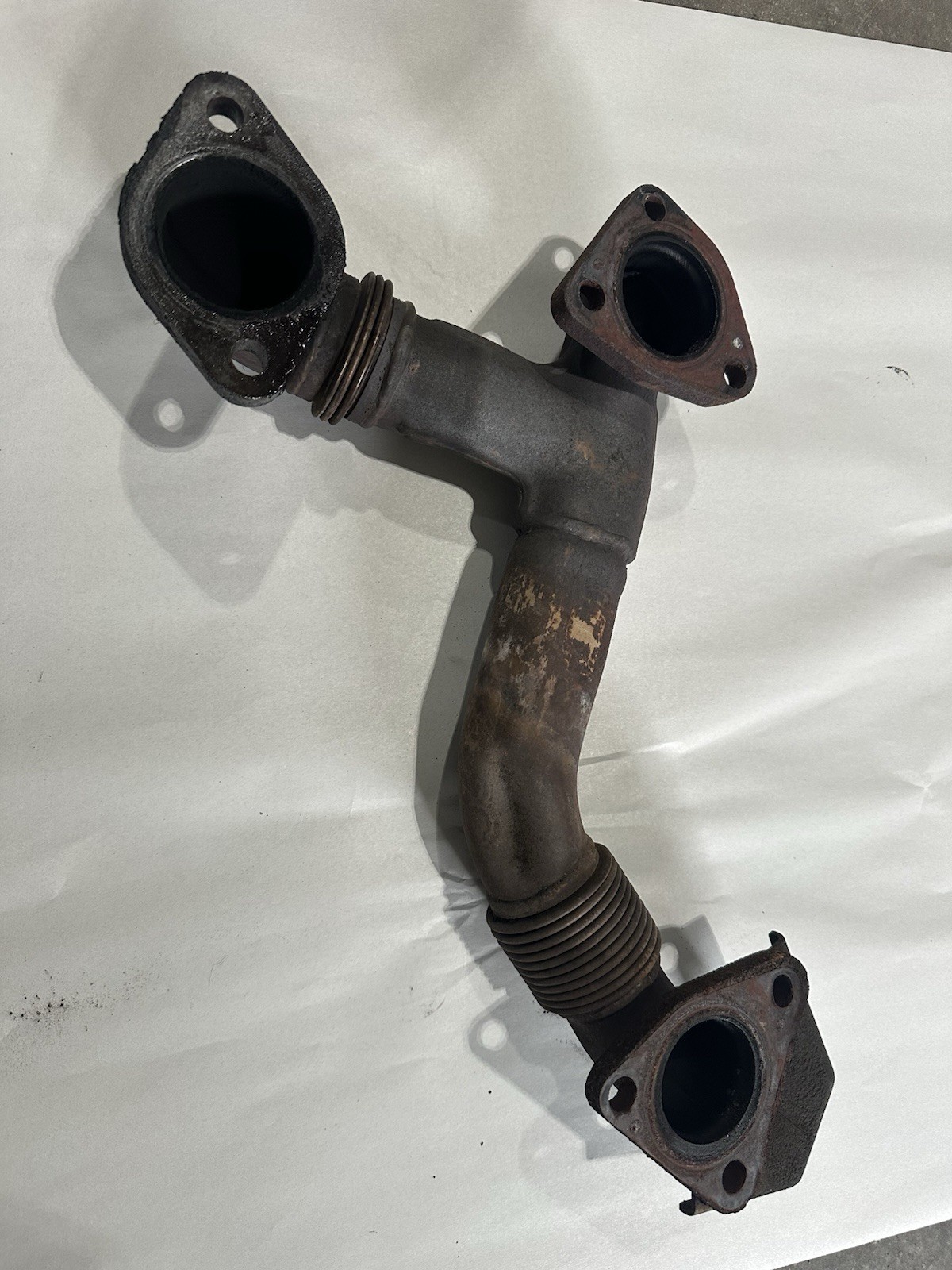 2006-2007 6.6L LBZ Duramax Passenger's Side Exhaust Up-pipe. Downpipe holding bracket has a crack as shown in pictures. This pipe will not fit a 2007.5 LMM Duramax engine. If unsure of which engine you have, please message for assistance.