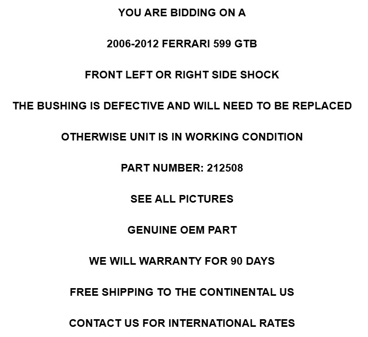<html> <head> </head> <body > <font rwr="1" style=""><font rwr="1" style=""><font rwr="1" style=""><font rwr="1" style=""><font rwr="1" style=""><font rwr="1" style=""><font rwr="1" style=""><font rwr="1" style=""><font rwr="1" style=""><font rwr="1" style=""><font rwr="1" style=""><font rwr="1" style=""><font rwr="1" style=""><font rwr="1" style=""><font rwr="1" style=""><font rwr="1" style=""><font rwr="1" style=""><b><font face="Arial" rwr="1" size="6" style=""></font></b></font><blockquote dir="ltr" style="margin-right: 0px;"><font face="Arial" size="6"><b><font rwr="1" style=""><font rwr="1" style=""> </font></font><font rwr="1" style=""><font rwr="1" style=""> </font></font><font rwr="1" style=""><font rwr="1" style=""> </font></font><font rwr="1" style=""><font rwr="1" style=""> </font></font><font rwr="1" style=""><font rwr="1" style=""> </font></font><font rwr="1" style=""><font rwr="1" style=""> </font></font><font rwr="1" style=""><font rwr="1" style=""> </font></font><font rwr="1" style=""><font rwr="1" style=""> <p style=""></p><div style="text-align: center;"><i style=""><font style=""><font style=""><font style=""><i style=""><font style=""><font style=""><font style=""><font style=""><font style=""><u style=""><font style=""><font style="">LANSDOWNE MOTORSPORT</font></font></u></font></font></font></font></font></i></font></font></font></i></div><blockquote dir="ltr" style="margin-right: 0px;"><blockquote dir="ltr" style="margin-right: 0px;"><blockquote dir="ltr" style="margin-right: 0px;"><blockquote dir="ltr" style="margin-right: 0px;"><blockquote dir="ltr" style="margin-right: 0px;"><blockquote dir="ltr" style="margin-right: 0px;"><blockquote dir="ltr" style="margin-right: 0px;"></blockquote></blockquote></blockquote></blockquote></blockquote></blockquote></blockquote><p style="text-align: center;"><i style="text-align: start;"></i></p><p align="center" style=""><i style=""><font style=""><i><u>160 E. PLUMSTEAD AVE, LANSDOWNE PA 19050</u></i></font></i><i> </i></p></font></font></b></font><blockquote dir="ltr" style="margin-right: 0px;"><div style="text-align: center;"><font face="Arial" size="6" style=""><b><br/>YOU ARE BIDDING ON A</b></font></div><div style="text-align: center;"><b style="font-family: Arial; font-size: xx-large;"><br/></b></div><div style="text-align: center;"><font face="Arial" size="6"><b>2006-2012 FERRARI 599 GTB</b></font></div><div style="text-align: center;"><font face="Arial" size="6"><b><br/></b></font></div><div style="text-align: center;"><b style="font-family: Arial; font-size: xx-large;">FRONT LEFT OR RIGHT SIDE SHOCK</b></div><div style="text-align: center;"><b style="font-family: Arial; font-size: xx-large;"><br/></b></div><div style="text-align: center;"><font face="Arial" size="6"><b>THE BUSHING IS DEFECTIVE AND WILL NEED TO BE REPLACED</b></font></div><div style="text-align: center;"><font face="Arial" size="6"><b><br/></b></font></div><div style="text-align: center;"><font face="Arial" size="6"><b>OTHERWISE UNIT IS IN WORKING CONDITION</b></font></div><div style="text-align: center;"><font face="Arial" size="6"><b><br/></b></font></div><div style="text-align: center;"><font face="Arial" size="6"><b>PART NUMBER: 212508</b></font></div><div style="text-align: center;"><font face="Arial" size="6"><b><br/></b></font></div><div style="text-align: center;"><font face="Arial" size="6"><b>SEE ALL PICTURES</b></font></div><div style="text-align: center;"><font face="Arial" size="6"><b><br/></b></font></div><div style="text-align: center;"><font face="Arial" size="6"><b>GENUINE OEM PART</b></font></div><div style="text-align: center;"><font face="Arial" size="6"><b><br/></b></font></div><div style="text-align: center;"><font face="Arial" size="6"><b>WE WILL WARRANTY FOR 90 DAYS</b></font></div><div style="text-align: center;"><b style="font-family: Arial; font-size: xx-large;"><br/></b></div><div style="text-align: center;"><b style="font-family: Arial; font-size: xx-large;">FREE SHIPPING TO THE CONTINENTAL US</b></div><div style="text-align: center;"><b style="font-family: Arial; font-size: xx-large;"><br/></b></div><div style="text-align: center;"><b style="font-family: Arial; font-size: xx-large;">CONTACT US FOR INTERNATIONAL RATES</b></div></blockquote></blockquote><blockquote dir="ltr" style="font-family: Arial; font-size: 14pt; margin-right: 0px;"><blockquote dir="ltr" style="margin-right: 0px;"><blockquote dir="ltr" style="font-size: 14pt; margin-right: 0px;"><font size="5"><strong></strong></font><font size="5"><strong></strong></font></blockquote></blockquote></blockquote></font></font></font></font></font></font></font></font></font></font></font></font></font></font></font></font> </body> </html>