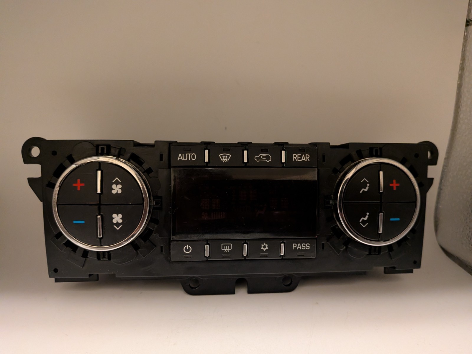 The product is a black screw-on HVAC control unit designed for Buick, Chevrolet, and GMC vehicles from 2007-2013, including the Acadia, Enclave, and Traverse models. Made of plastic, this OE/OEM part comes with a 30-day manufacturer warranty and features universal fitment without the need for drilling or modifications. It is a high-quality replacement part with interchange part numbers 25932036, 25869249, 25775006, 20778545, 25869251, and 25932038. Ideal for left-hand drive vehicles, this control unit is a reliable choice for maintaining your vehicle's air conditioning and heating systems.