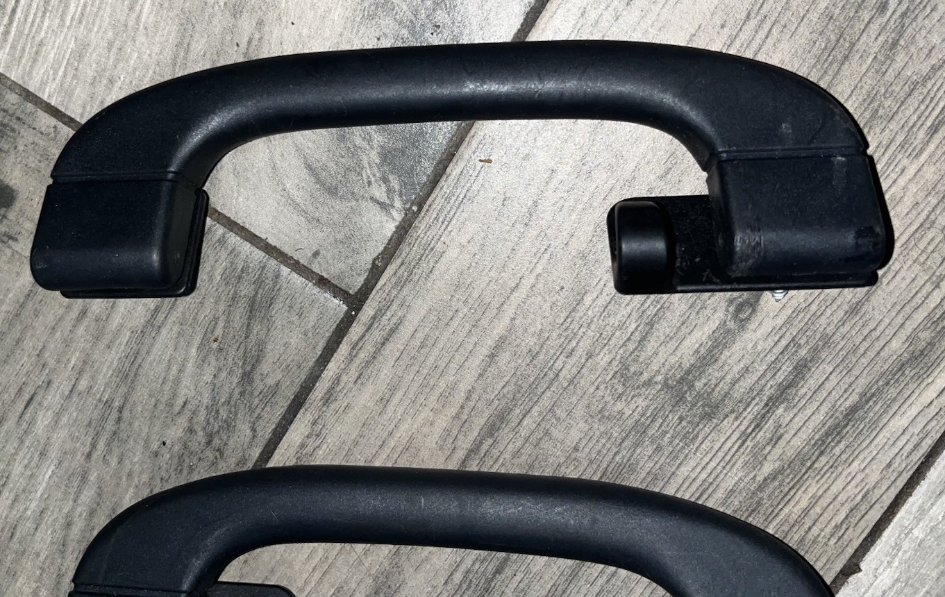 This product is a set of two black interior roof grab handles designed specifically for the 2007-2013 BMW X5 E70. Made of plastic, these handles are a genuine BMW part originating from Germany. They come with screws included for easy installation on the left front side of the vehicle. Minor scratches from use OEM
