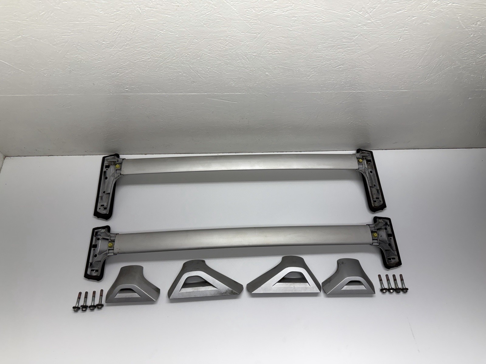 Up for purchase is a set of 2 USED OEM horizontal roof rack crossbars for a 2009 - 2010 Pontiac Vibe. This set includes the 2 HORIZONTAL cross bars, cross bar end caps and mounting bolts. Cross bars are in good, used condition with some cosmetic wear from previous use. The end caps are all present, but some have some broken mounting tabs as shown. The main mounting tabs are present on the roof rack at each of the 4 mounting locations and the receiving slots are not cracked out on the 4 end caps. I would recommend using some type of silicone sealant or adhesive on the caps when installing to ensure they remain in place after install. Mounting bolts are included, but the receiver nuts are not. They SHOULD be present on your vehicle from factory, but I cannot guarantee that. If you get on a stool or ladder and check out your roof drip rail, you should be able to find the locations where these would mount and see if you can see the receiver nuts there. Not the best condition, but these are almost impossible to find in any condition. Depending on buyer address, the mounts at the ends of the bars might be removed to make shipping more compact. If that is the case, a torx bit will be provided to allow you to put them back on upon receipt. Photos are of the actual item you will receive, so please inspect photos for condition and ask questions prior to purchase. **\*To prevent fraud, this item is stamped with a custom made heat stamp that melts a mark into an unseen portion of the part to prove that the part came from me. Returns for items damaged during shipping MUST bear this logo or else the claim will be dismissed. Any alteration to the marking will also cause the dismissal of a damage return. If you have any questions about this, please contact me prior to purchase.**