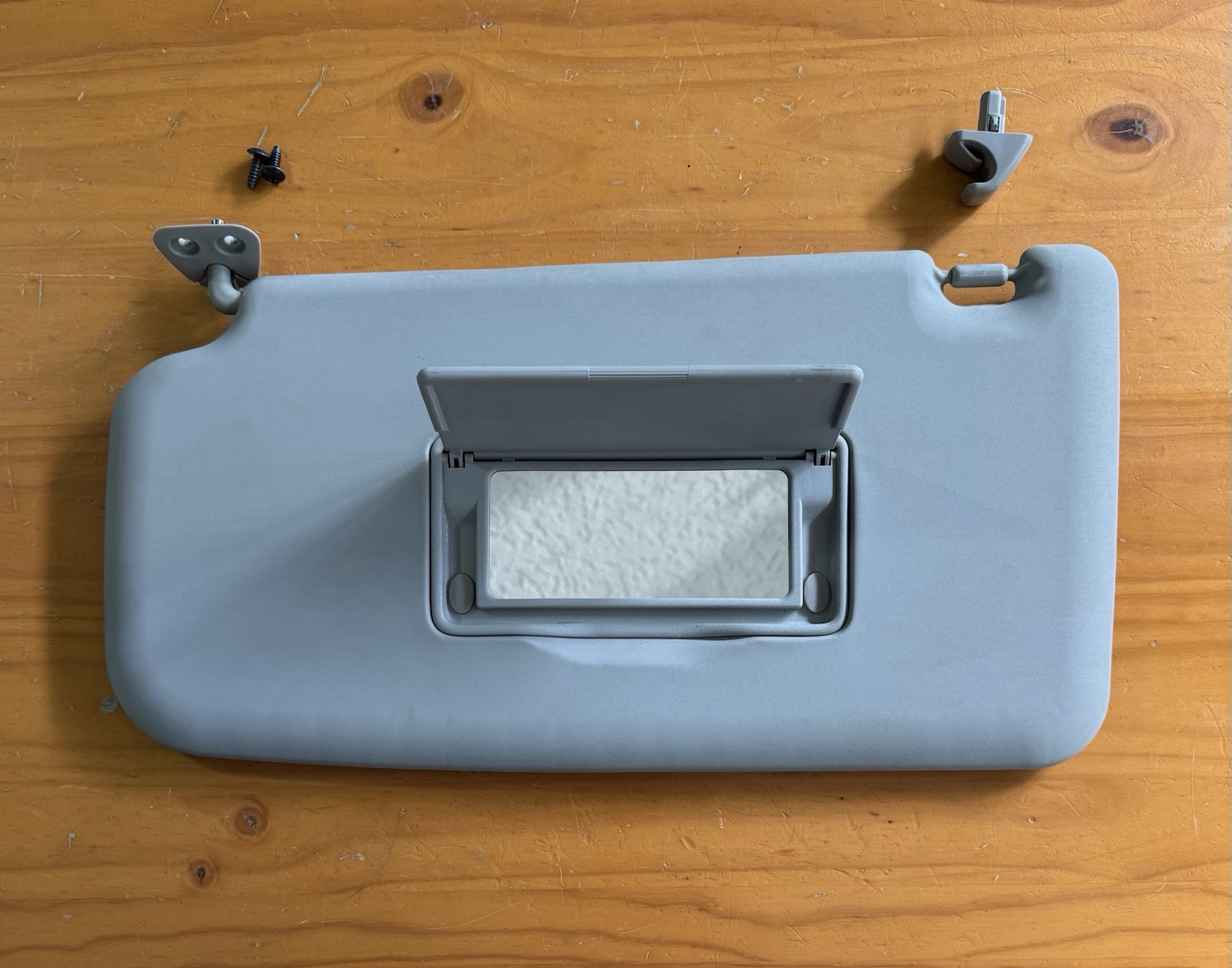 The product is a genuine OEM driver side sun visor for a 2009-2014 Nissan Cube, featuring a light gray color and easy installation. The sun visor is made of vinyl material, ensuring durability and easy cleaning. Comes with the mounting screws and the retainer clip. This sun visor is a practical and essential accessory for your Nissan Cube. In great condition. OEM Fast and free shipping.