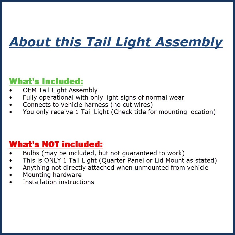 This will fit the following vehicles... (CLICK HERE) # 2009 Mini Clubman RH Passenger Tail Light Lamp OEM ### Vehicle Fitment & Product Details - Please Check Vehicle Fitment Below Prior To Purchasing **This will fit:** **Mini Clubman 2008-2010 w/clear lens (center), R.** * * * **This Tail Light Assembly is in good, working condition. Please do not assume anything else will be included if it is not pictured.** All of the parts we sell are guaranteed to be in good working condition unless otherwise noted. We ONLY guarantee the part(s) will fit the vehicle(s) listed in the description. If your vehicle was not originally equipped with the EXACT part(s) listed, it is your responsibility to consult a dealer to see if it will fit your application. Additional items may be needed if this is an upgrade or custom installation. Please consult your local dealer for ALL other applications. LKQ Online reserves the right to cancel/refund any order that had parts described incorrectly, had incorrect pricing information or was out of stock/damaged. We do our best to prevent these issues from happening and apologize for any inconvenience it may cause. * * * **If included, ALL Bulbs are sold AS-IS without a warranty. Bulbs are fragile and can easily be damaged during shipping which is why we do not warranty them. Among other things, these laws and regulations prohibit or require a license for the export of certain types of commodities and technical data to specified countries. CUSTOMER hereby acknowledges that it will comply with, and will cause its AFFILIATES and SUBCONTRACTORS to comply with, all United States export control laws and regulations, that CUSTOMER bears sole responsibility for any export of certain commodities and technical data and any violation of such laws and regulations by itself or its AFFILIATES or SUBCONTRACTORS. CUSTOMER and its AFFILIATES and SUBCONTRACTORS will indemnify, defend, and hold LKQ ONLINE harmless for any consequences of any such violation. **We cannot ship to the Canadian Yukon Territory.