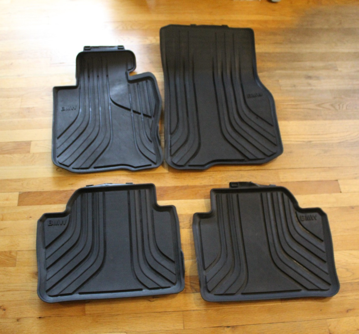 The 2011-2019 BMW 3 Series F30/F31/F34 All-Weather Floor Mats are a set of four black rubber mats designed specifically for the interior of these BMW models. They are easy to install and clean, making them both convenient and practical for everyday use. These floor mats are tailored to fit the rear, left, front, and right areas of the vehicle, providing protection and style for your BMW's interior. Perfect for keeping your car's flooring clean and looking new, these floor mats are a must-have accessory for any BMW owner.