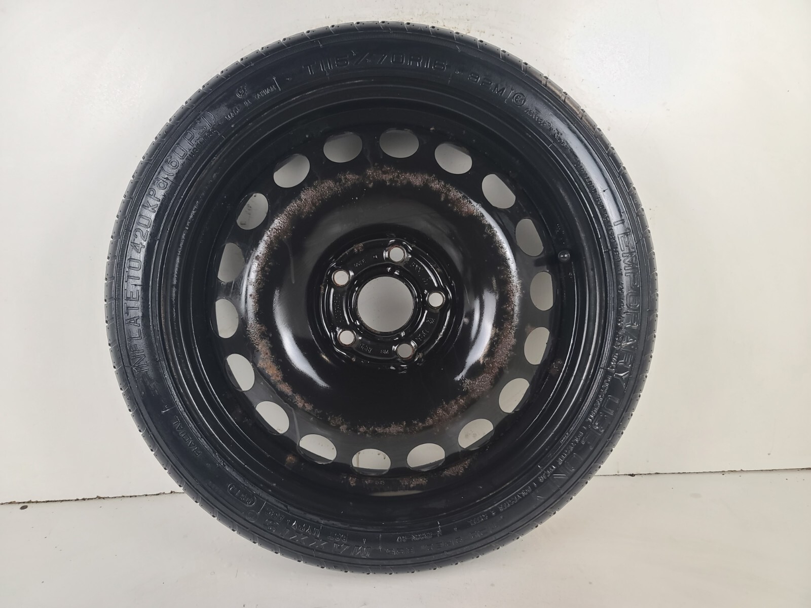 **MINI DONUT SPARE TIRE NOT A FULL-SIZE SPARE COMES MOUNTED WITH THE WHEEL** **FAST AND FREE SHIPPING** **(SORRY WE ARE SHIPPING ONLY TO THE 48 CONTINENTAL USA STATES)** **MAY HAVE FEW SPOTS/STAINS/RUST/SCRATCHES, SEE PICTURES.** **OUR COMPACT SPARES ARE MOUNTED FULL WITH AIR AND READY TO USE** **Please magnify and study all images before purchase.** **Please verify tire size and compatibility before purchase.**