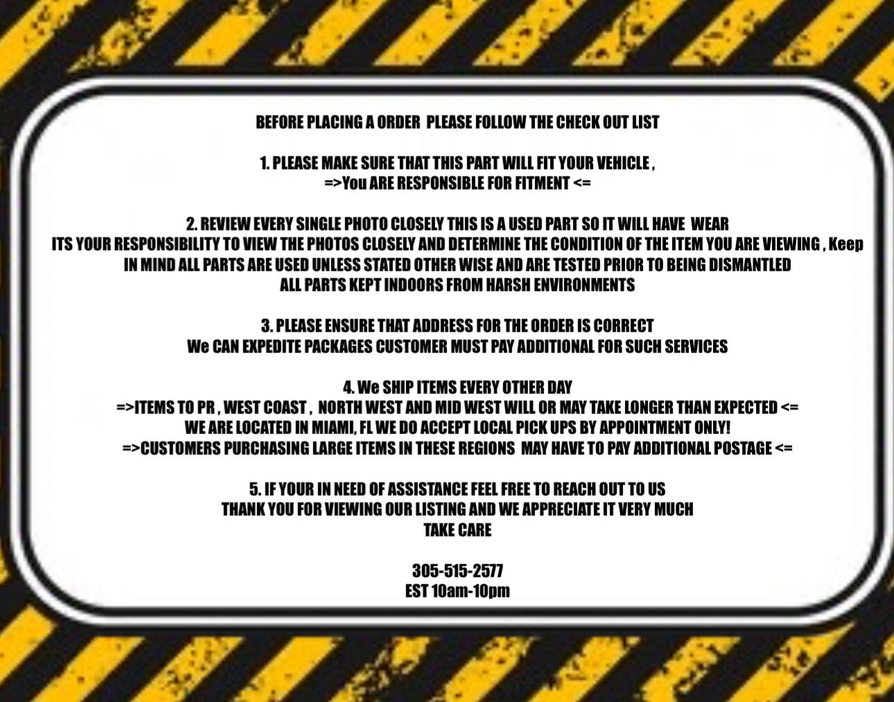 # Welcome to Our Store! Trusted OEM Auto Parts from South Florida! We specialize in high-quality, **OEM used auto parts** with over **20 years of professional experience** in the automotive industry. Based in **South Florida**, we provide reliable parts for all types of vehicles ? from sedans and SUVs to trucks and specialty cars. We know how important it is to receive the **right part, in good condition, and at a fair price**. That's why we thoroughly inspect and test every item, photograph it clearly, and store all parts **indoors**, safe from extreme weather conditions. When you shop with us, you're buying from licensed, permitted, and honest professionals who take pride in offering excellent value and service. * * * ## IMPORTANT SHIPPING NOTICE <= FOR LARGE, OVERSIZED, OR HEAVY ITEMS We offer **nationwide shipping across the continental U.S.**, but shipping rates for **large or heavy auto parts** can vary depending on your location. If you live in the following regions, **shipping costs may be significantly higher** due to freight carrier rates and increased delivery distance from our South Florida base: - **West Coast** California, Oregon, Washington - **Southwest** Arizona, Nevada, New Mexico - **Upper Midwest & Great Lakes** Illinois, Wisconsin, Michigan,Iowa etc. - **Puerto Rico, Hawaii, and Alaska** ### Common large items affected include: - Rims and wheels - Doors, hoods, fenders, and bumpers - Engines and transmissions - Transfer cases and differentials - RACK AND PINON'S - SIDE SKIRTS BODY PARTS ETC - Intake/exhaust manifolds and engine components **Please message us before purchasing** if you're in one of these areas and buying a large item. Were happy to **give you a custom shipping quote**, help you avoid unexpected costs, and make sure the item is properly packaged and shipped safely. * * * ## ITEM CONDITION & ACCURACY We take quality seriously: - All parts are **tested**, **inspected**, and **photographed** before shipment. - What you see in the listing photos is **exactly what you'll receive**. - Every item title includes what is **guaranteed to be included**. - (Sensors, modules, or accessories shown in the photo may not be included unless specifically listed in the title or description.) - Light dirt, scratches, or wear are normal for used parts but will be clearly shown in photos. **Review all photos carefully** before purchasing, and don't hesitate to reach out if you have any questions were here to help! * * * ## FITMENT CUSTOMER RESPONSIBILITY It is **100% the customers responsibility** to confirm fitment **before purchasing**. We strongly recommend that you: - Check and compare part numbers - Review listing photos thoroughly - Contact your local dealership for fitment assistance - Send us your **VIN number** and well try to help We **cannot be held responsible** for incorrect purchases if the correct part/model number is clearly listed. If you are unsure, **please message us first** well gladly assist you in identifying the correct part. * * * ## FREIGHT ITEMS ENGINES, TRANSMISSIONS & MORE If you purchase a **freight-sized item** (engine, transmission, transfer case, etc.): - You must provide a **valid phone number** for the freight carrier to schedule delivery. - We will **reach out before shipping** to confirm fitment please respond promptly. - **Freight charges are non-refundable.** - Return shipping for large/freight items is the buyer responsibility if: - You ordered the wrong part - You failed to confirm fitment - You no longer want the item We package all freight items securely and work with trusted carriers, but delays can happen especially for oversized shipments. We appreciate your patience and communication. * * * ## INSTALLATION & WARRANTY POLICY We stand behind our parts but correct installation is essential. If you're purchasing: - **Engines** - **Transmissions** - **Differentials** - **ECUs / TCMs / modules** Please follow these guidelines: 1. All electronic control units **must be reprogrammed** by a qualified technician. 2. **Engines and transmissions require professional installation**: - Replace oil and fluids - Install new gaskets, filters, and sensors - Use **factory-recommended oils and fluids** 3. **Proof of issue** (video, photos, mechanic report) is required for warranty claims. 4. **Warranty does not cover labor costs**, installation errors, or improper maintenance. If a part turns out to be faulty, we will **work with you directly** to resolve the issue quickly and fairly we take pride in our honesty and professionalism * * * ## RETURNS, CANCELLATIONS & CUSTOMER SERVICE We want every customer to be satisfied that's why we offer **easy returns** with honesty and respect. - Please **message us before starting a return or opening a case** we'll work it out with you. - Once an item has been **shipped**, we cannot cancel the order. - If your package is **lost, delayed, or damaged**, contact us ASAP we'll investigate and keep you updated. - Returns must be initiated with **honest descriptions** of the issue. We appreciate your cooperation. We do not ship directly outside of the U.S. * * * ## WHY CHOOSE US? ## **Over 20 years of auto part sales experience** - Licensed and permitted to sell used parts - All items are **in stock**, **tested**, and **ready to ship** - Fast turnaround **same-day or next-day shipping** - Every item is inspected and photographed - **We price competitively** and accept reasonable offers just message us! - CONTACT US ANYTIME Have questions? Need help confirming fitment? Want to bundle multiple parts or get a better deal? Message us **anytime, 24/7** ? we respond quickly and are happy to assist. Don't forget to **follow our store** ? we add new OEM parts regularly and may have what you need in the future! * * * ## THANK YOU We appreciate your business and thank you for choosing us. When you buy from us, you're supporting a **local, experienced, and honest business** that cares about its customers. We?ll always do our b