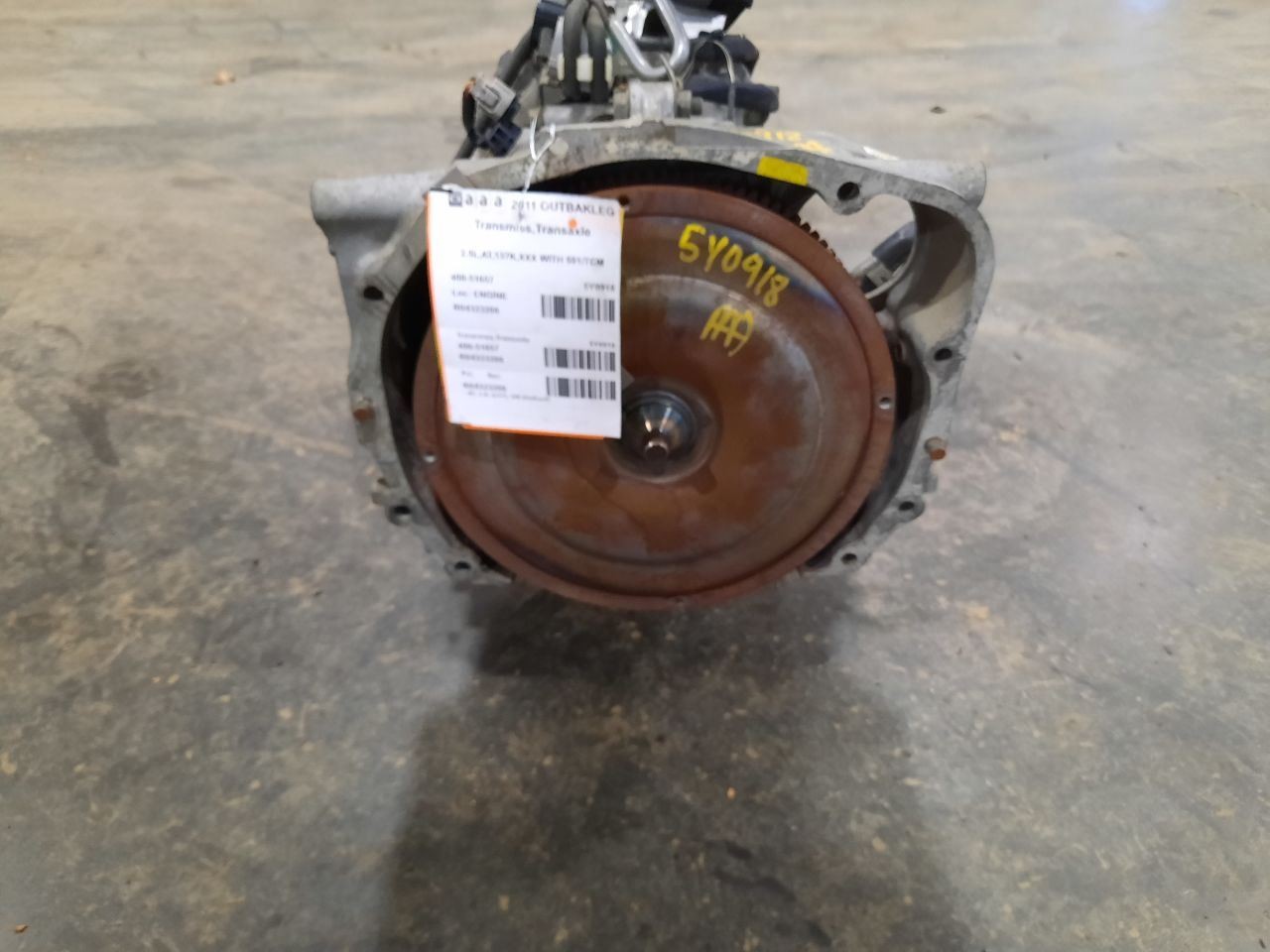 Item Description **6 MONTH WARRANTY!! 60 DAY NO HASSLE RETURNS!!** **This for a USED OEM Transmission/Transaxle Assembly pulled from a 2011 OUTBAKLEG with 137000 actual miles on it.** **Here are our part notes about this specific part:** **2.5L,AT,137K,WITH 591/TCM** **Our Part #: 400-51657, 4323206** **Our Stock#: 5Y0918** Please see the fitment section below to make sure this will fit your vehicle. Pay special attention to any options listed!!! In some cases, it may only fit vehicle with certain options or specific ID#s as listed below. **LEGACY 11-12 AT; 2.5L (CVT), SW (Outback)** Whats Included? Whats Included? FAQ/ Help Shipping Payment Returns/Warranty #### Whats Included? ``` Here is a short description of what will generally be included with your item. If you would like more information or are unsure if something will come with your item, PLEASE ASK!! A/C Compressor: Includes the clutch/pulley assembly A/C Condenser: Sensors and hoses are not included ABS Units: Include the ATTACHED electronic module unless otherwise noted Alternator: Includes the pulley. Any brackets are not included Axle/CV shaft: Does not include the axle nut Blower Motor: Include the squirrel cage/fan blade Caliper: Includes the bracket and slides. Slides are not covered under warranty Column Switch: Includes wiring (if applicable) up to the first point it can be unplugged Control Arm: Includes the ball joint and any bushings Coolant Overflow Bottle: Cap is included Cowl Vent Panel: See Our Part notes, often sold as one side only Differential Carrier: Does not include axles Door Trim Panel: Includes handle and armrest. Does not include window/lock switches Engine: Included for convenience unless otherwise noted. These parts are not covered under warranty: Intake manifold, fuel injectors, oil pan, sensors, water pump Not included: Throttle body, Turbo, wiring harness exhaust manifold (may be left on in certain cases) Exhaust Manifold: Does not include turbo where applicable Fan Assembly: Includes motors, shroud, and blades. Fuel injectors: See our part notes Fuel Filler Door: Includes hinge. Does not include bolts/hardware Fuel Pump: Includes sending unit and any molded hoses that are non-removable Headlight: Brackets are included unless otherwise noted. HID headlights include the bulbs and ballast Hub: Includes wheel studs Ignition Coil(s): See part notes Interior Rear View Mirror: Does not included bracket glued to windshield Jack: See part notes. If noted as assembly, it will include the lug wrench Mass Airflow Sensor: Does not include housing unless pictured Power Steering Pump: Includes pulley and ATTACHED reservoir. Remote reservoirs and brackets will not be included Power Steering Gear: Includes pitman arm Rack and Pinion: Includes tie rods but they are not covered under warranty Radio: Pay special attention to our fitment description. Often times radios are more than one piece and we sell them each separately Spindle/Knuckle: Does not include hub unless noted Starter: Includes solenoid Strut: Struts are left assembled and include top plate, spring, and dust boot (dust boots on used struts are rarely in perfect shape) Stabilizer Bar: Does not include links or bushings Sunvisor: Does not include clip Taillight: Pay special attention to fitment as we list the trunk lid mounted taillights as well as the corners. Does not include bulbs Temperature Control: Includes all knobs, buttons, and sliders Throttle Body: Includes sensors but they are not covered under our warranty Transmission: Automatic transmissions include torque converters and sensors. Many newer transmissions require a relearn/programming procedure. Manual transmissions do not include any part of the clutch system. Transfer Case: Does not include electric shift motor Washer Reservoir/Bottle: Includes cap unless noted Wheel/Rim: Does not include center cap, tire, or lug nuts Window Regulator: Does not include motor unless noted (most are noted with motor) Wiper Motor: Does not include arms or transmission unless noted Wiper Transmission: Does not include motor or arms unless noted ``` FAQ/ Help #### FAQ/ Help ``` Will this fit my vehicle? Is this the right part? This is the most common question that we get. The fitment information can be confusing if you don't buy replacement parts everyday. Please contact us if you are unsure!! We try to respond to questions as quickly as possible and we are more than happy to answer any questions as best as we can. In order to speed up the process, it is very helpful, but not required, for you to send us your full VIN number along with your question. It looks like its the same color as my car, how can I tell for sure? The best way is to match the manufacturer paint code. Most of the time we include the paint code in our part notes. If you don't know what a paint code is or where yours is located, please feel free to ask. We are happy to help. I only see photos of the vehicle and not the actual part you are selling. Can you send me some? Our most recent listings include actual photos when we can provide them. If you would like an actual photo, we are more than happy to take one after the purchase for your approval before the part ships. In certain cases we will take actual photos before a purchase is made. This is on a case by case basis. Send us a message and we will let you know if it is possible for us to do so I see a wheel that says it is "B" condition, what does that mean? Grading of parts is a very subjective process but we do our best to keep it uniform. Here is a brief description of wheel grades: A Condition, A-COND = This is the highest grade used wheel. It will have very minor imperfections but will be in better condition than 90% of vehicles on the road. B Condition, B-COND = This wheel will have some cosmetic imperfections. It is in average condition for the year and mileage of the donor vehicle. It may have minor scratches and clear coat peeling. This is still a fairly nice looking, used wheel C C