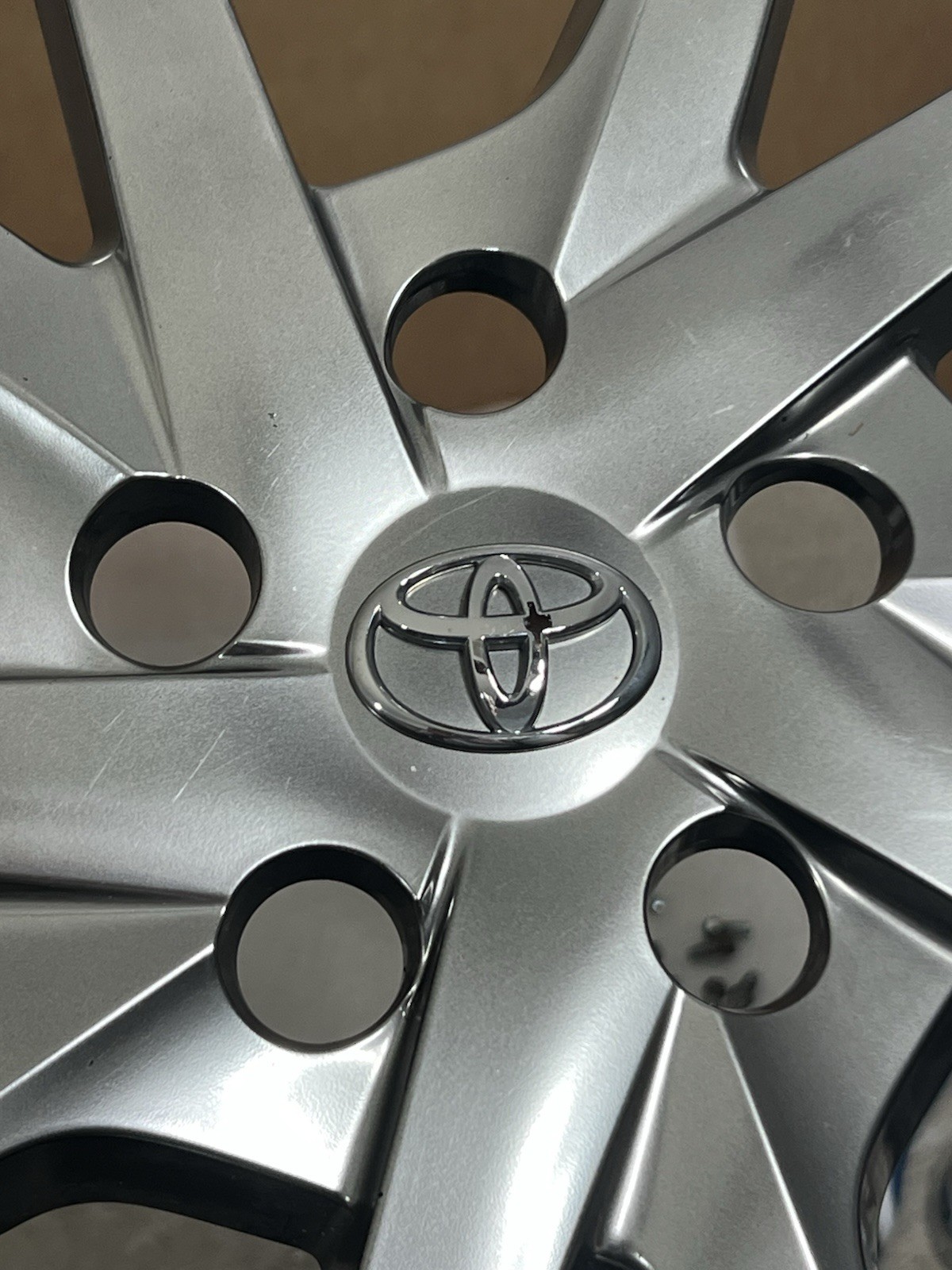 This listing is for ONE USED genuine Toyota hubcap. \\*\\*\\* NOTE: this is hyper silver finish- not the light normal silver paint style. Some scratches mainly on edge / some fading on the sides of some spokes--see additional pictures. All rear clips and metal ring are intact.