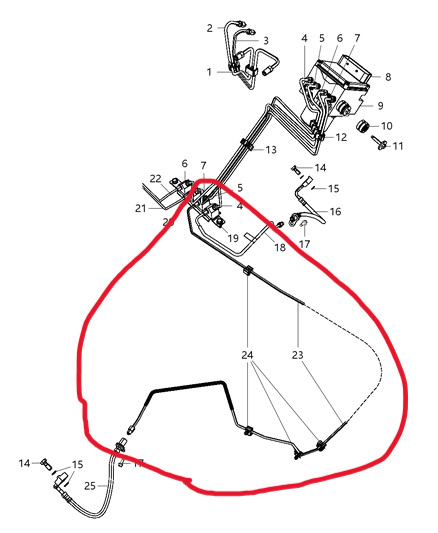 2012 Ram 1500 only. 4X4 Only. Crosses from left side junction block to right side caliper.