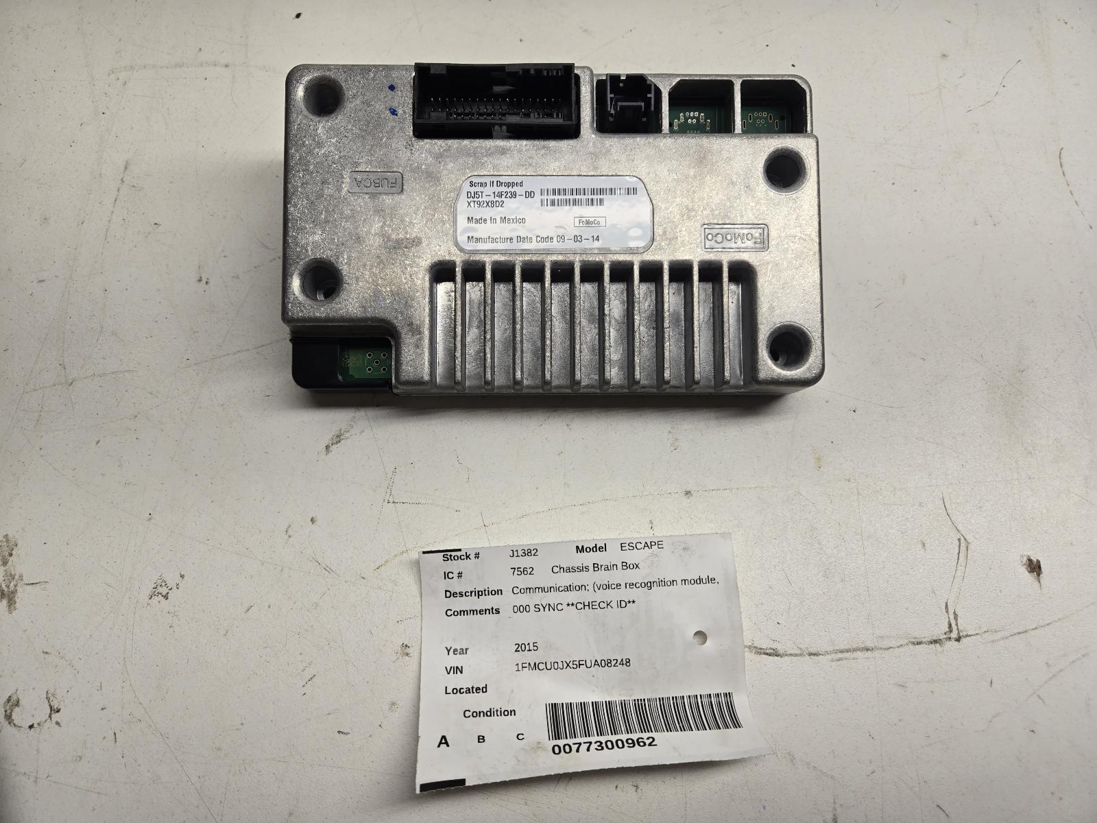ST JAMES [](https://www.youtube.com/watch?v=3ostOVAKvTY)  Part comments: 000 SYNC \*\*CHECK ID\*\* . Message or call us for extended warranty details and pricing, additional information, or any questions you have on the item! - All newer vehicles come with a 3 piece radio system. Control panel is the controls. The Radio/Receiver is where the disk goes in. The screen is the display for the Radio/Receiver! Please see pictures and description if you are unsure. - Each Chassis Brain Box is quality checked by our experienced dismantle technicians and mechanics before they are priced and listed. Problems encountered will be covered by our warranty, and all damages will be pictured or noted on the listing. - We ship to the lower 48 states, No Alaska, Hawaii, APO/FPO, or PO boxes. We ship all items UPS or freight. All freight items must be inspected by purchaser before signing for item. If for some reason there is an issue, please do not accept and be sure to note to delivery driver. Freight items must be shipped to an address with a loading dock or forklift, residential delivery with a lift gate will be an extra $150 for freight. Customer pickup is always welcome. Message us with any questions! - Our warranty doesn't cover ordering an incorrect part, buyer will be responsible for return shipping and 20% restocking fee. Always double check compatibility! SPECIFICATION **PARTS COMMENTS** 000 SYNC \*\*CHECK ID\*\* **ITEM DETAILS** **Make / Model:** FORD ESCAPE **Year:** 2015 **Stock Number:** J1382 **VIN:** 1FMCU0JX5FUA08248 **Odometer:** 120010 Miles **Color:** Silver **Tag Number:** 0077300962 **PART ALSO FITS** TAURUS2015 \- 2015Communication; (voice recognition module, Sync, under console), ID EJ5T-14D212-DA TAURUS2015 \- 2019Communication; (voice recognition module, Sync, under console), ID EA5T-14D212-DA TAURUS2014 \- 2014Communication; (voice recognition module, Sync, under console), ID DA5T-14D212-KA TAURUS2013 \- 2014Communication; (voice recognition module, Sync, under console), ID DA5T-14D212-AA thru AP EXPLORER2012 \- 2015Communication; (voice recognition module, Sync), ID EA5T-14D212-BA EXPLORER2013 \- 2014Communication; (voice recognition module, Sync), ID DA5T-14D212-KA EXPLORER2012 \- 2012Communication; (voice recognition module, Sync), ID BT4T-14D212-BV EXPLORER2013 \- 2014Communication; (voice recognition module, Sync), ID DA5T-14D212-AA thru AP EXPLORER2012 \- 2012Communication; (voice recognition module, Sync), ID BT4T-14D212-BU EXPLORER2011 \- 2011Communication; (voice recognition module, Sync), ID DA5T-14D212-KA EXPLORER2015 \- 2016Communication; (voice recognition module, Sync), ID EA5T-14D212-DA FOCUS2012 \- 2014Communication; (voice recognition, Sync module), ID DA5T-14D212-AA thru AL FOCUS2013 \- 2014Communication; (voice recognition, Sync module), ID DA5T-14D212-KA FOCUS2015 \- 2018Communication; (voice recognition, Sync module), ID EA5T-14D212-DA ESCAPE2013 \- 2013Communication; (voice recognition module, Sync, under console), ID DA5T-14D212-KA ESCAPE2014 \- 2015Communication; (voice recognition module, Sync, behind the display screen), ID DJ5T-14F239-DD ESCAPE2015 \- 2015Communication; (voice recognition module, Sync, behind the display screen), ID EA5T-14D212-BA ESCAPE2014 \- 2015Communication; (voice recognition module, Sync, behind the display screen), ID EA5T-14D212-DA ESCAPE2014 \- 2014Communication; (voice recognition module, Sync, behind the display screen), ID DA5T-14D212-KA ESCAPE2014 \- 2014Communication; (voice recognition module, Sync, behind the display screen), ID DA5T-14D212-BA ESCAPE2013 \- 2013Communication; (voice recognition module, Sync, under console), ID DA5T-14D212-AA thru AP ESCAPE2014 \- 2014Communication; (voice recognition module, Sync, behind the display screen), ID DA5T-14D212-AA thru AP FORD F150 PICKUP2013 \- 2013Communication; (voice recognition, Sync module), ID DA5T-14D212-AA thru AP FORD F150 PICKUP2013 \- 2014Communication; (voice recognition, Sync module), ID EA5T-14D212-BA FORD F150 PICKUP2013 \- 2013Communication; (voice recognition, Sync module), ID DA5T-14D212-KA FORD F150 PICKUP2014 \- 2014Communication; (voice recognition, Sync module), ID EA5T-14D212-DA FORD F250SD PICKUP2013 \- 2013Communication; (Sync module, glove box mounted), ID DC3T-14F239-AL FORD F250SD PICKUP2013 \- 2014Communication; (Sync module, glove box mounted), ID DA5T-14D212-KA FORD F250SD PICKUP2016 \- 2016Communication; (Sync module, glove box mounted), ID EA5T-14D212-DA FORD F250SD PICKUP2013 \- 2014Communication; (Sync module, glove box mounted), ID DA5T-14D212-AA thru AN FORD F350SD PICKUP2013 \- 2014Communication; (Sync module, glove box mounted), ID DA5T-14D212-KA FORD F350SD PICKUP2013 \- 2014Communication; (Sync module, glove box mounted), ID DA5T-14D212-AA thru AN FUSION2014 \- 2016Communication; (voice recognition module, Sync, under console), ID EA5T-14D212-BA FUSION2013 \- 2014Communication; (voice recognition module, Sync, under console), ID DA5T-14D212-AA thru AP FUSION2013 \- 2014Communication; (voice recognition module, Sync, under console), ID DA5T-14D212-KA FUSION2014 \- 2016Communication; (voice recognition module, Sync, under console), ID EA5T-14D212-DA EDGE2014 \- 2014Communication; (voice recognition, Sync module), ID DA5T-14D212-KA EDGE2012 \- 2012Communication; (voice recognition, Sync module), ID BT4T-14D212-BV EDGE2014 \- 2014Communication; (voice recognition, Sync module), ID EA5T-14D212-DA EDGE2013 \- 2013Communication; (voice recognition, Sync module), ID DA5T-14D212-AA thru AN EDGE2014 \- 2014Communication; (voice recognition, Sync module), ID EA5T-14D212-BA EDGE2011 \- 2011Communication; (voice recognition, Sync module), ID EA5T-14D212-BA EDGE2014 \- 2014Communication; (voice recognition, Sync module), ID DA5T-14D212-AA thru AP MKX2014 \- 2014Communication; (voice recognition, Sync module), ID DA5T-14D212-KA MKX2013 \- 2013Communication; (voice recognition, Sync module), ID DA5T-14D212-AA thru AN MKX2012 \- 2012Communication; (v