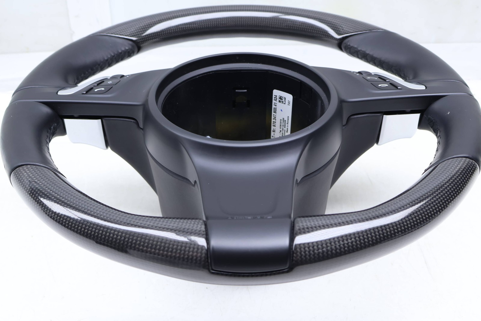 Please click here to view detais [](#photo-1)[](#photo-2)[](#photo-3)[](#photo-4)[](#photo-5)[](#photo-6)[](#photo-7)[](#photo-8)[](#photo-9)[](#photo-10)[](#photo-11)[](#photo-12)  Description Condition Notes SOME WEAR AND SCRATCHES, SEE PICTURES ## Part Specs SKU Number673560Color(s)Carbon Fiber, BlackOE Part Number97034780341BrandPorsche ## Fitment Chart Year2014-2016MakePorscheModelPanameraTrimHatchbackEngine3.0L Diesel Turbo, 3.0L Gas Supercharged, 3.0L Gas Turbo, 3.6LGas, 4.8LGas, 4.8L Gas Turbo 2014-2016 PORSCHE PANAMERA GTS 970 - 3-Spoke Sport Steering Wheel 97034780341 - Fitment ChartYearMakeModelTrimEngineRestrictions2014-2016PorschePanameraHatchback3.0L Diesel Turbo, 3.0L Gas Supercharged, 3.0L Gas Turbo, 3.6LGas, 4.8LGas, 4.8L Gas Turbo Why Buy ## Why Buy **Genuine OEM Parts**All the parts we sell are OEM. \*Unless otherwise stated.**Top Rated**We have been around since 2010 and have amassed tens of thousands of positive feedback in that time.**30-Day Return Policy**All parts purchased through us comes with a 30-day money back guarantee. \*Unless otherwise stated.**Free Shipping**Parts shipped within the continental U.S are eligible for Free Shipping. \*Unless otherwise stated.**Same Day Shipping**We'll ship your part(s) out the same day if you order them by 12:00 PM (Central Standard Time).**Indoor Storage**All parts are stored indoors and away from the outdoor elements.**Cleaned & Tested**Our parts are cleaned and tested, ensuring you're getting a quality part every time.**Large Inventory**We have over 100 thousand Audi, Volkswagen & Porsche parts in-stock and ready to ship. Disclaimer ## Disclaimer **Mechanical Parts** Most all of our parts are Recycled / Used. All of our parts are found to be in good working condition before they are listed for sale (Unless stated otherwise). All of our parts are stored indoors. **Interior / Exterior / Cosmetic Parts** Most of our parts listed are in good condition (unless stated otherwise) but please keep in mind that these are recycled / used parts, not new and may show some signs or normal wear. We do try our hardest to tell you of all defects in the listing description. **Part Fitment and Compatibility** The buyer is responsible for determining compatibility / Interchangeability of a part. Please use the fitment chart provided to determine part compatibility. Feel free to contact us with questions about part compatibility. We will try our best to help you out. Shipping ## Shipping **Same day shipping if paid by 12:00PM (CST)** • All items are shipped within 1 business day of payment being received. **WE SHIP WORLDWIDE!** **IMPORTANT NOTICE FOR INTERNATIONAL SHIPMENTS:** • If no shipping price is listed, please contact us for a shipping quote. • All international orders may be subject to their custom fees or brokerage fees or duty tax which we do not pay. • All buyers must pay for their own customs fees or brokerage fees or duty tax. • These fees vary due to price of item and government rate. Please contact your government website or shipping company to calculate fees. Warranty and Returns ## Warranty This part has a 30-day warranty. The 30 day period starts when you take possession of the part. No labor warranty is provided. This warranty is not trasferable. Only the original purchaser can file a warranty claim. In the event a part sold with a warranty fails to operate within the warranty period, we will replace the part(s) with a functionally equivalent part. If we do not have a replacement, a refund will be given in the amount of the original purchase price of the part. ## Returns This part may be returned for a refund within 30 days of delivery of the part. Return shipping is the buyers responsibility. There is a 20% restocking fee on all non defective parts. To return an item you must contact us within the 30 day period to obtain a RMA number (return material authorization). Once you obtain an RMA number, ship the item back to: Wolf Auto Parts 127 6th Street South, Waverly, MN 55390 Contact ## Contact Have questions about this listing or the product that you've already purchased? ### Business Hours: Monday - Thursday - 8 AM to 5 PM Friday - 8 AM to 2 PM Saturday - Closed Sunday - Closed (Central Standard Time). Remember LEFT means the DRIVER'S side of the vehicle and RIGHT means the PASSENGER'S side in our listings. Audi® is a registered trademark of Audi AG.