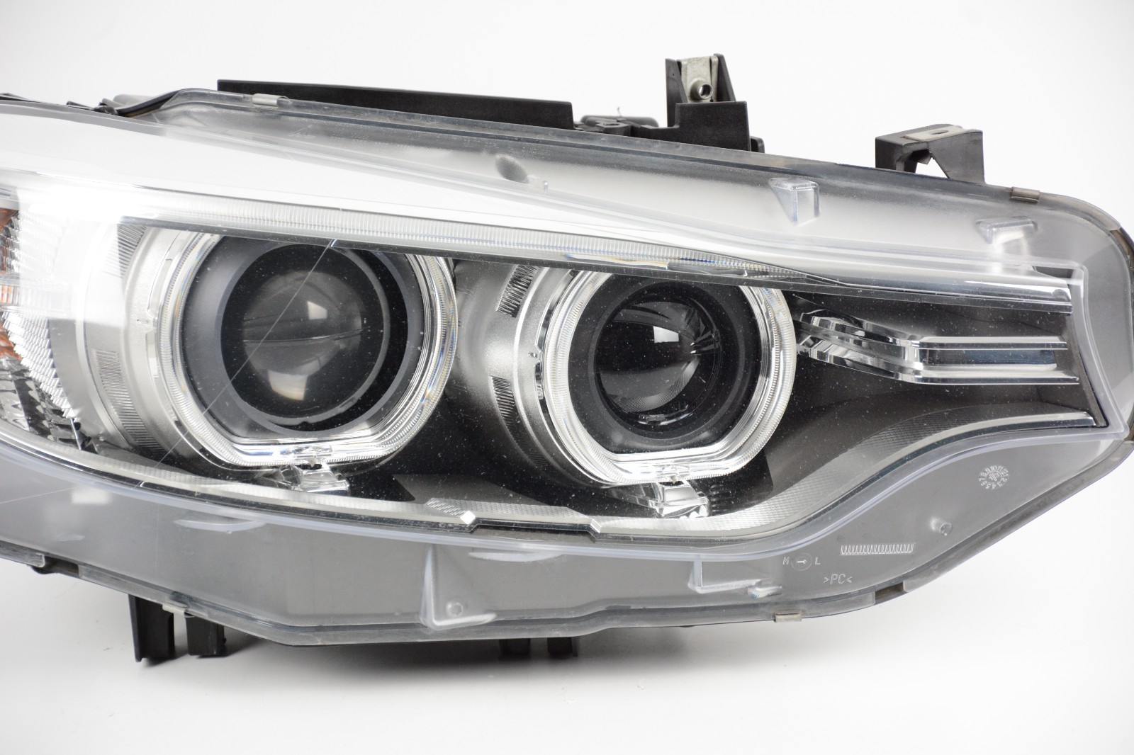2014-2017 BMW 4 Series F80 M3 M4 Right RH Passenger Side Xenon HID Headlight OEM Lens is in used condition with pitting. All mounting tabs are intact; one lower tab is repaired. HID bulb and modules are not included.