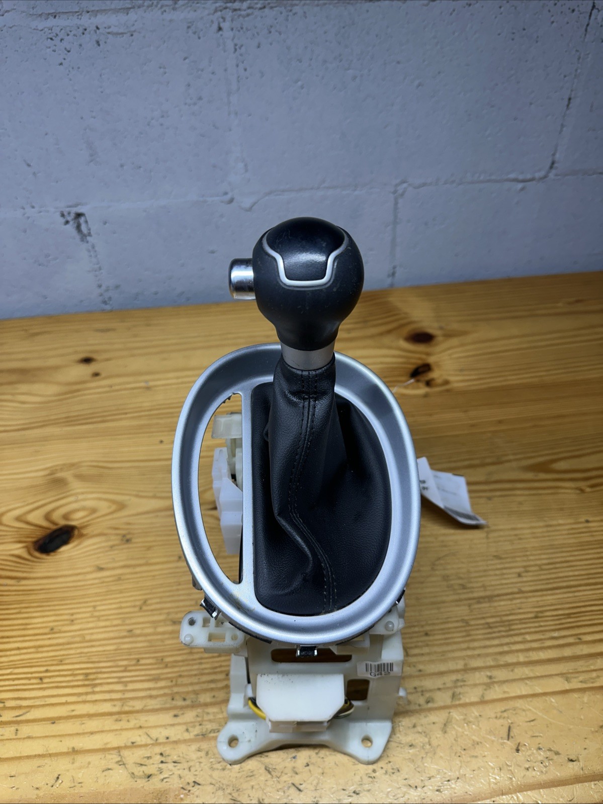 OEM automatic transmission gear shifter assembly designed specifically for the 2014-2019 Kia Soul. This shifter body includes the shifter knob and is suitable for a vehicle with automatic transmission. It is a used part from a 2017 model with some slight wear on the knob. It is a reliable replacement for a Kia Soul shifter assembly.