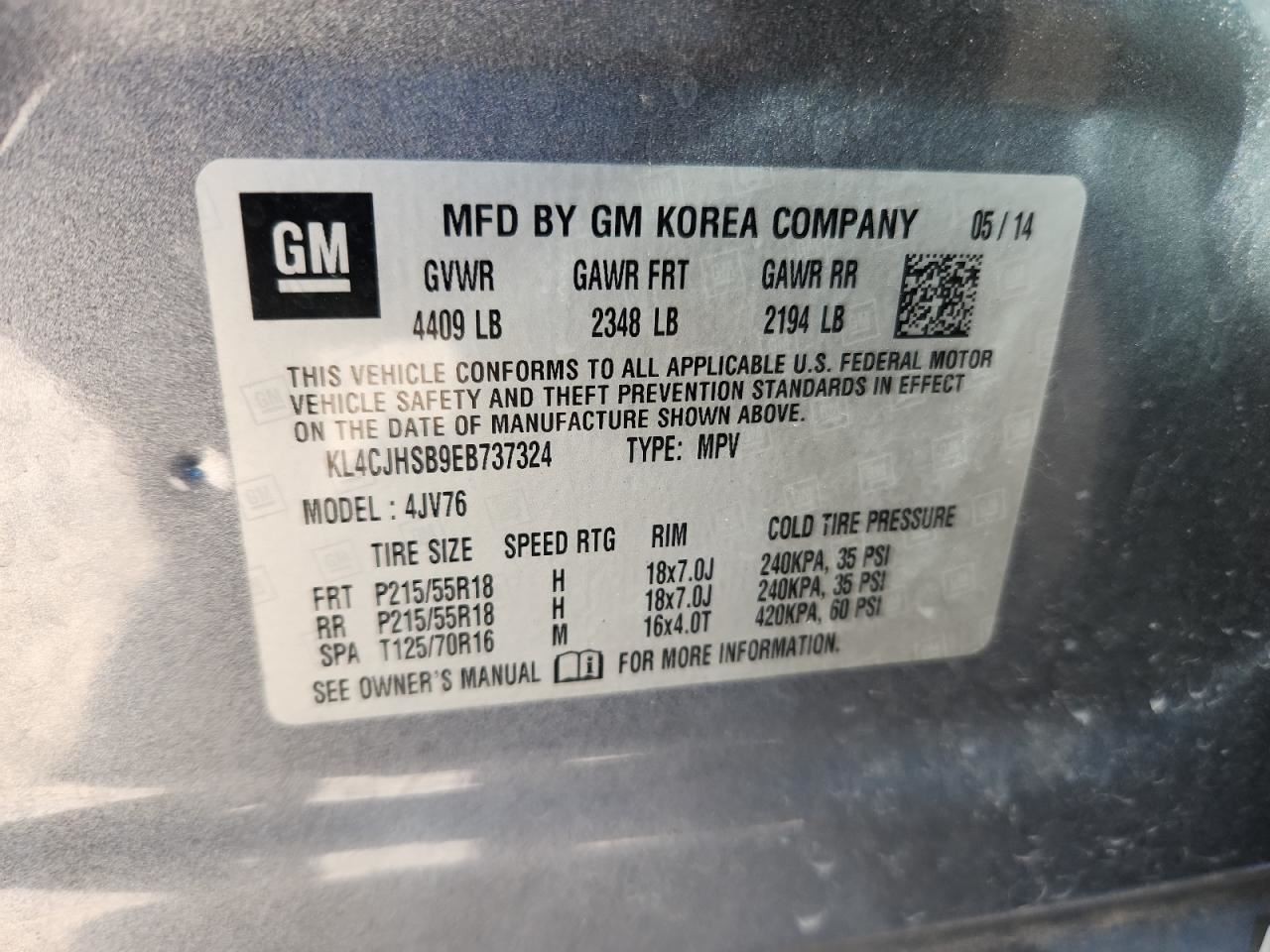 - VIN #: KL4CJHSB9EB737324