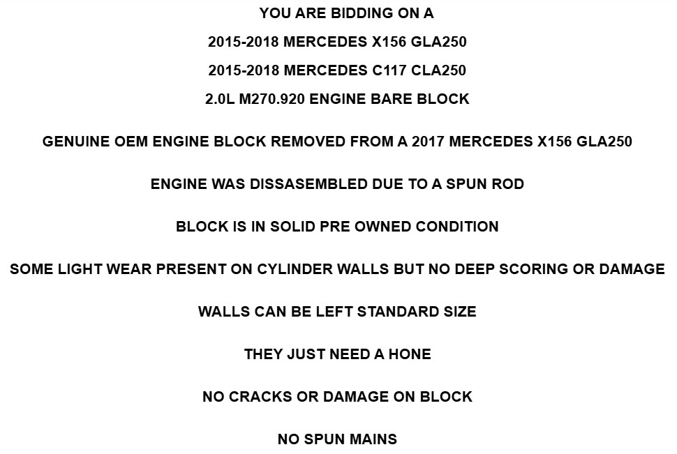 <html> <head> </head> <body > <font rwr="1" style=""><font rwr="1" style=""><font rwr="1" style=""><font rwr="1" style=""><font rwr="1" style=""><font rwr="1" style=""><font rwr="1" style=""><font rwr="1" style=""><font rwr="1" style=""><font rwr="1" style=""><font rwr="1" style=""><font rwr="1" style=""><font rwr="1" style=""><font rwr="1" style=""><font rwr="1" style=""><font rwr="1" style=""><font rwr="1" style=""><font rwr="1" style=""><font rwr="1" style=""><font rwr="1" style=""><font rwr="1" style=""><font rwr="1" style=""><font rwr="1" style=""><font rwr="1" style=""><font rwr="1" style=""><font rwr="1" style=""><font rwr="1" style=""><font rwr="1" style=""><font rwr="1" style=""><font rwr="1" style=""><font rwr="1" style=""><font rwr="1" style=""><font rwr="1" style=""><font rwr="1" style=""><font rwr="1" style=""><font rwr="1" style=""><font rwr="1" style=""><font rwr="1" style=""><blockquote dir="ltr" style="margin-right: 0px;"> <blockquote dir="ltr" style="font-family: Arial; font-size: 14pt; margin-right: 0px;"> <blockquote dir="ltr" style="margin-right: 0px;"> <blockquote dir="ltr" style="margin-right: 0px;"> <blockquote dir="ltr" style="font-size: 14pt; font-family: Arial; margin-right: 0px;"> <blockquote dir="ltr" style="MARGIN-RIGHT: 0px"> <blockquote dir="ltr" style="MARGIN-RIGHT: 0px"> <blockquote dir="ltr" style="MARGIN-RIGHT: 0px"> <p><strong></strong></p></blockquote></blockquote></blockquote></blockquote></blockquote></blockquote></blockquote><div style="font-family: Arial; font-weight: bold; font-size: 14pt; text-align: center;"><span style="font-size: 14pt; font-weight: 400; text-align: start;"><div style="text-align: center;"><i style="font-family: Times; font-size: medium;"><font face="Verdana"><strong><font size="6"><font style="font-family: Arial;"><i><font face="Verdana"><strong><font size="6"><font size="4" style="font-family: Arial;"><font size="4"><font size="4"><u><b><font face="Verdana"><font size="6">LANSDOWNE MOTORSPORT</font></font></b></u></font></font></font></font></strong></font></i></font></font></strong></font></i></div></span><p style="font-size: 18.6667px; font-weight: 400; text-align: start;"><strong></strong></p><p align="center" style="font-weight: 400; font-family: Times; font-size: medium;"><i><font face="Verdana"><strong><font size="6"><font style="font-family: Arial;"><i><font face="Verdana"><strong><font size="6"><font size="4" style="font-family: Arial;"><font size="4"><font size="4"><u><b><font face="Verdana"><font size="6">160 E. PLUMSTEAD AVE, LANSDOWNE PA 19050</font></font></b></u></font></font></font></font></strong></font></i></font></font></strong></font></i></p></div><div style="text-align: center;"><font face="Arial" size="6" style=""><b style="">YOU ARE BIDDING ON A</b></font></div></blockquote><div style="text-align: center;"><span style="text-align: start;"><div style="text-align: center;"><div style=""><p align="center" style="font-family: Arial;"><font size="6"><b>2015-2018 MERCEDES X156 GLA250</b></font></p><p align="center" style="font-family: Arial;"><font size="6"><b>2015-2018 MERCEDES C117 CLA250</b></font></p></div></div></span></div><blockquote dir="ltr" style="margin-right: 0px;"><blockquote dir="ltr" style="margin-right: 0px;"><blockquote dir="ltr" style="margin-right: 0px;"><blockquote dir="ltr" style="margin-right: 0px;"></blockquote></blockquote></blockquote></blockquote><div style="text-align: center;"><font face="Arial" size="6"><b>2.0L M270.920 ENGINE BARE BLOCK</b></font></div><div style="text-align: center;"><br/></div><div style="text-align: center;"><br/></div><div style="text-align: center;"><font face="Arial" size="6"><b>GENUINE OEM ENGINE BLOCK REMOVED FROM A 2017 MERCEDES X156 GLA250</b></font></div><div style="text-align: center;"><font face="Arial" size="6"><b><br/></b></font></div><div style="text-align: center;"><font face="Arial" size="6"><b>ENGINE WAS DISSASEMBLED DUE TO A SPUN ROD</b></font></div><div style="text-align: center;"><font face="Arial" size="6"><b><br/></b></font></div><div style="text-align: center;"><font face="Arial" size="6"><b>BLOCK IS IN SOLID PRE OWNED CONDITION</b></font></div><div style="text-align: center;"><font face="Arial" size="6"><b><br/></b></font></div><div style="text-align: center;"><font face="Arial" size="6"><b>SOME LIGHT WEAR PRESENT ON CYLINDER WALLS BUT NO DEEP SCORING OR DAMAGE</b></font></div><div style="text-align: center;"><font face="Arial" size="6"><b><br/></b></font></div><div style="text-align: center;"><font face="Arial" size="6"><b>WALLS CAN BE LEFT STANDARD SIZE</b></font></div><div style="text-align: center;"><font face="Arial" size="6"><b><br/></b></font></div><div style="text-align: center;"><font face="Arial" size="6"><b>THEY JUST NEED A HONE</b></font></div><div style="text-align: center;"><font face="Arial" size="6"><b><br/></b></font></div><div style="text-align: center;"><font face="Arial" size="6"><b>NO CRACKS OR DAMAGE ON BLOCK</b></font></div><div style="text-align: center;"><font face="Arial" size="6"><b><br/></b></font></div><div style="text-align: center;"><font face="Arial" size="6"><b>NO SPUN MAINS</b></font></div><div style="text-align: center;"><font face="Arial" size="6"><b><br/></b></font></div><div style="text-align: center;"><font face="Arial" size="6"><b>NO WARPING ON DECK SURFACE</b></font></div><div style="text-align: center;"><font face="Arial" size="6"><b><br/></b></font></div><div style="text-align: center;"><font face="Arial" size="6"><b>ALL USED BLOCKS SHOULD BE BROUGHT TO A MACHINIST BEFORE BUILDING</b></font></div><div style="text-align: center;"><br/></div><div style="text-align: center;"><font face="Arial" size="6"><b>WILL SHIP VIA UPS GROUND</b></font></div><div align="center" style=""><p dir="ltr"><font face="Arial" size="6" style=""><b> CONTACT US FOR INTERNATIONAL RATES</b></font></p></div> <div style="text-align: center;"><br/></div><blockquote dir="ltr" style="font-size: 14pt; font-family: Arial; margin-