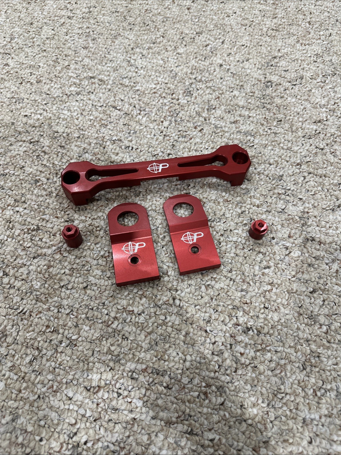 Bought a car from a Machine shop who were trying to make parts for the Car. Billet battery tie down with these really cool billet integrated nuts and radiator stays. Both are anodized red and have some kind of logo on them.