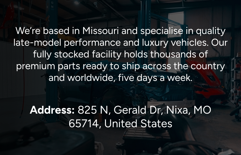 Document Returns Available Fast Shipping 100% Satisfaction  Wide Range of Parts We stock parts for various makes and models, ensuring you find what you need. Quality Assurance All parts are tested and inspected for reliability and performance. Fast & Reliable Quick processing and shipping to get you back on the road faster. Expert Assistance Our knowledgeable team helps you find the right part quickly and easily. - We accept credit cards and cash for approved local pickup orders. - Orders must be paid within 3 calendar days of purchase. We do not control tax rates or calculations. Shipping (Non-Freight) - Orders ship on the next business day after the payment has cleared. - Orders placed on weekends or holidays ship the next business day. - We ship via USPS, UPS, or FedEx, and reserve the right to select or change carriers as needed. - Shipping rates are based on the destination ZIP code and apply to the lower 48 states only. - Expedited shipping may be available at an additional cost. Buyers must contact us before purchasing to confirm availability. All expedited shipping fees are non-refundable. We do not control international shipping costs, taxes, customs fees, or tracking for international orders. - Local pickup is available for all items. Buyers must contact us in advance to ensure the order is prepared. Freight Shipping - Large items (including but not limited to engines, transmissions, body panels, axles, exhausts, interiors, cradles, etc.) ship via freight. - Freight orders ship within 1–3 business days after cleared payment and receipt of required delivery information. - Freight transit times may take up to 7 business days. - Locations without a dock or forklift require a liftgate service, which must be disclosed at time of purchase. - Residential freight delivery must be quoted prior to purchase and typically costs significantly more than commercial delivery. Return - Customer satisfaction is important to us. Please contact us before initiating a return. - We offer a 60-day return period, beginning on the delivery date. - All parts are inspected and tested prior to shipment. If an item arrives damaged or defective, contact us promptly so we can resolve the issue. - Paint color matching is not guaranteed. No refunds will be issued for color or paint mismatches due to repainting, fading, or manufacturer variations. - Returns due to buyer error or preference (including but not limited to “ordered by mistake,” “does not fit,” “changed mind,” or “found better price”) are subject to a 20% deduction, and original shipping is non-refundable. - Items returned damaged or not in original condition may incur up to a 50% deduction. - All items include a seller identification mark and are inspected upon return. Refunds will only be issued for items returned with this identifier intact. - If damage occurs during shipping, buyers must provide sufficient documentation to support a carrier damage claim. - We are not responsible for installation errors, labor costs, or related expenses. - No returns on international orders. - Special-order items (including body cuts, frame cuts, etc.) are final sale and non-refundable. Warranty - This part includes a 1-Year Limited Warranty from the date of purchase. This is the sole and exclusive warranty provided for this part. - If the part is defective during the warranty period, we will replace the part or refund the purchase price. This warranty applies to the part only and does not cover labor, installation, fluids, accessories, or incidental expenses. - The warranty is void if the part is installed incorrectly, misused, abused, modified, or if proper maintenance is not followed. Engines and transmissions must be installed by a certified repair facility. All parts are sold as tested and inspected for functionality; the installer is responsible for fitment verification. - Airbags and SRS components are sold AS IS with no warranty. Sheet metal parts are warranted only against factory corrosion under normal use. - I certify this airbag is not subject to recall and will be shipped in accordance with hazmat shipping requirements - This airbag has been inspected and verified by the seller and is not subject to any open safety recall at the time of listing. The airbag was removed from the vehicle in accordance with industry standards and will be shipped in compliance with all applicable hazardous materials regulations. Some panels in worse shape than others but overall got what I expected, as described. I was able to fix them with parts off my old panels. Overall very satisfied! They look great in the car. Shipping was pricey, but you gotta do what you gotta do! The item was as described and value was great. Didn't budge on the pallet and was waterproof. Exactly as pictured and passed my initial inspection with no damage. Priced right, shipped timely. No worries. The seller is very responsive to communication and an excellent person to deal with. 10 out of 10 would recommend. Shipping cost was normal and the item was well packaged. Can’t ask for more than that!  We're based in Missouri and specialise in quality late-model performance and luxury vehicles. Our fully stocked facility holds thousands of premium parts ready to ship across the country and worldwide, five days a week. **Address:** 825 N, Gerald Dr, Nixa, MO 65714, United States Business Hours Monday to Friday: 9:00 AM - 5:00 PM Visit By Appointment Only