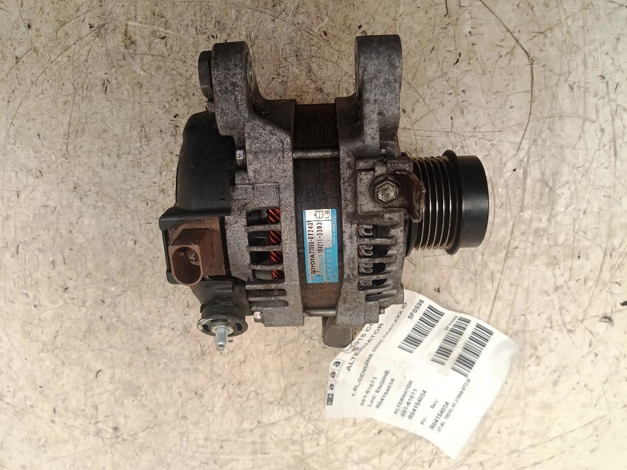 Item Description **6 MONTH WARRANTY!! 60 DAY NO HASSLE RETURNS!!** **This for a USED OEM Alternator Assembly pulled from a 2015 COROLLA with 124000 actual miles on it.** **Here are our part notes about this specific part:** **1.8L,GENUINE OEM PART,270600T240** **Our Part #: 601-61072, 4154054** **Our Stock#: 5F0598** Please see the fitment section below to make sure this will fit your vehicle. Pay special attention to any options listed!!! In some cases, it may only fit vehicle with certain options or specific ID#s as listed below. **COROLLA 14-16 (1.8L, 100A), ID 27060-0T240** **COROLLA 17-18 (Sdn, 1.8L, 100A), ID 27060-0T240** **COROLLA 19 Sedan (1.8L, 100A), ID 27060-0T240** Whats Included? Whats Included? FAQ/ Help Shipping Payment Returns/Warranty #### Whats Included? ``` Here is a short description of what will generally be included with your item. If you would like more information or are unsure if something will come with your item, PLEASE ASK!! A/C Compressor: Includes the clutch/pulley assembly A/C Condenser: Sensors and hoses are not included ABS Units: Include the ATTACHED electronic module unless otherwise noted Alternator: Includes the pulley. Any brackets are not included Axle/CV shaft: Does not include the axle nut Blower Motor: Include the squirrel cage/fan blade Caliper: Includes the bracket and slides. Slides are not covered under warranty Column Switch: Includes wiring (if applicable) up to the first point it can be unplugged Control Arm: Includes the ball joint and any bushings Coolant Overflow Bottle: Cap is included Cowl Vent Panel: See Our Part notes, often sold as one side only Differential Carrier: Does not include axles Door Trim Panel: Includes handle and armrest. Does not include window/lock switches Engine: Included for convenience unless otherwise noted. These parts are not covered under warranty: Intake manifold, fuel injectors, oil pan, sensors, water pump Not included: Throttle body, Turbo, wiring harness exhaust manifold (may be left on in certain cases) Exhaust Manifold: Does not include turbo where applicable Fan Assembly: Includes motors, shroud, and blades. Fuel injectors: See our part notes Fuel Filler Door: Includes hinge. Does not include bolts/hardware Fuel Pump: Includes sending unit and any molded hoses that are non-removable Headlight: Brackets are included unless otherwise noted. HID headlights include the bulbs and ballast Hub: Includes wheel studs Ignition Coil(s): See part notes Interior Rear View Mirror: Does not included bracket glued to windshield Jack: See part notes. If noted as assembly, it will include the lug wrench Mass Airflow Sensor: Does not include housing unless pictured Power Steering Pump: Includes pulley and ATTACHED reservoir. Remote reservoirs and brackets will not be included Power Steering Gear: Includes pitman arm Rack and Pinion: Includes tie rods but they are not covered under warranty Radio: Pay special attention to our fitment description. Often times radios are more than one piece and we sell them each separately Spindle/Knuckle: Does not include hub unless noted Starter: Includes solenoid Strut: Struts are left assembled and include top plate, spring, and dust boot (dust boots on used struts are rarely in perfect shape) Stabilizer Bar: Does not include links or bushings Sunvisor: Does not include clip Taillight: Pay special attention to fitment as we list the trunk lid mounted taillights as well as the corners. Does not include bulbs Temperature Control: Includes all knobs, buttons, and sliders Throttle Body: Includes sensors but they are not covered under our warranty Transmission: Automatic transmissions include torque converters and sensors. Many newer transmissions require a relearn/programming procedure. Manual transmissions do not include any part of the clutch system. Transfer Case: Does not include electric shift motor Washer Reservoir/Bottle: Includes cap unless noted Wheel/Rim: Does not include center cap, tire, or lug nuts Window Regulator: Does not include motor unless noted (most are noted with motor) Wiper Motor: Does not include arms or transmission unless noted Wiper Transmission: Does not include motor or arms unless noted ``` FAQ/ Help #### FAQ/ Help ``` Will this fit my vehicle? Is this the right part? This is the most common question that we get. The fitment information can be confusing if you don't buy replacement parts everyday. Please contact us if you are unsure!! We try to respond to questions as quickly as possible and we are more than happy to answer any questions as best as we can. In order to speed up the process, it is very helpful, but not required, for you to send us your full VIN number along with your question. It looks like its the same color as my car, how can I tell for sure? The best way is to match the manufacturer paint code. Most of the time we include the paint code in our part notes. If you don't know what a paint code is or where yours is located, please feel free to ask. We are happy to help. I only see photos of the vehicle and not the actual part you are selling. Can you send me some? Our most recent listings include actual photos when we can provide them. If you would like an actual photo, we are more than happy to take one after the purchase for your approval before the part ships. In certain cases we will take actual photos before a purchase is made. This is on a case by case basis. Send us a message and we will let you know if it is possible for us to do so I see a wheel that says it is "B" condition, what does that mean? Grading of parts is a very subjective process but we do our best to keep it uniform. Here is a brief description of wheel grades: A Condition, A-COND = This is the highest grade used wheel. It will have very minor imperfections but will be in better condition than 90% of vehicles on the road. B Condition, B-COND = This wheel will have some cosmetic imperfections. It is in average condition for the year and mileage of the donor vehicle. It may 
