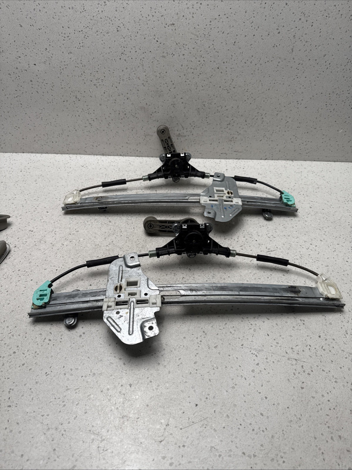 The product is a pair of manual window regulators for the front left and right sides of a 2015 Kia Rio sedan. These regulators are designed specifically for Kia vehicles and are operated manually. They are essential components for controlling the movement of the windows in the car, providing convenience and functionality for the driver and passengers. The placement on the vehicle is crucial for proper installation and operation, ensuring that the window regulators are in the correct position to function effectively.