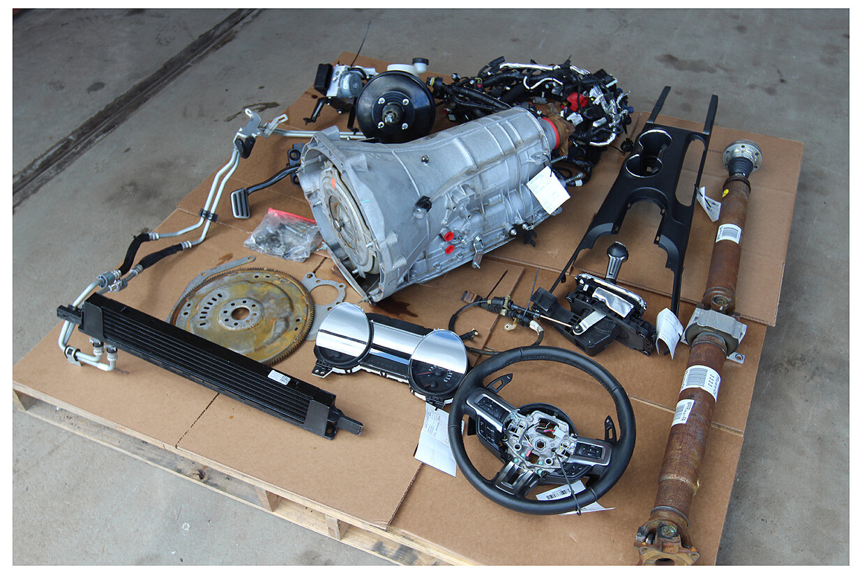 _**THIS MUST BE SENT TO A BUSINESS ADDRESS WITH LOADING DOCK/FORKLIFT OR YOUR CLOSEST FEDEX FREIGHT TERMINAL OTHERWISE FREIGHT SURCHARGES WILL APPLY.**_ **_Please read the payment info below as we do not take credit cards or paypal for items this large in value. =)_** **The Parts Farm presents:** **This listing is a GOOD USED** **Ford Mustang 6R80, 6 SPEED automatic transmission conversion kit.** **This kit is designed to convert your 2016-2017 Mustang GT that came with a manual transmission over to the 6r80 automatic. ( wont fit 2015)** **We can turn off the anti- theft off on this ecu if needed!** **This means the anti-theft aspect that locks the car down when you swap the ecu out will no longer be active!** **We offer this to help you get to the local dealer to reprogram your speedo, BCM.** **Make sure you as for premium or base kit. They are different.** **This kit comes with:** - **6R80 6 speed automatic** **transmission** - **OEM torque converter** - **8 bolt oem flexplate** - **Front dust cover** - **Bell-housing bolts** - **Flexplate bolts** - **Auto trans harness** - **OEM Auto Shifter and cable** - **Brake pedal assembly** - **Auto steering wheel with paddle shift** - **Transmission cooler & lines** - **Auto brake fluid reservoir and booster** - **ABS module** - **Speedo cluster** - **OEM Auto Driveshaft** - **upper console section with shift bezel trim** - **Engine and transmission computer ( optional pats delete)** - **engine, dash, steering column harness** **BE aware that 2015 and 2016 engines had different coil packs. You might need to change coil packs depending on what the build date is!** **Great working condition.** **\-\-\--------------------------** **SHIPPING PROCEDURE:** **This item must ship truck freight.** **Please send your zip code for a freight quote!** **This needs to go to a business address with a** **forklift or a dock OR to your closest freight terminal.** **Residence delivery fee Adds $90** **Lift gate service adds $90** **Payment Procedure:** **$200 deposit due at time of purchase. This can be paid by** **Paypal or Credit card. This deposit is not refundable. Payment in full** **due within 7 business days or deposit will be forfeited and the item relisted** **for sale..** **The balance must be paid for by certified funds. PLEASE INSPECT ALL FREIGHT BEFORE ACCEPTING DELIVERY !!!!!!! !!!!!! IF YOU SIGN AND IT IS DAMAGED IT IS YOURS !!!!!! !!!!!!!! IF YOU REFUSE IT DO TO SHIPPING DAMAGE WE WILL SEND A REPLACEMENT!!!!!!!!!!!! Due to the nature of the purchase, there are no refunds on engines, engine kits, transmission kits, transmissions, or other engine/trans related special order kits..