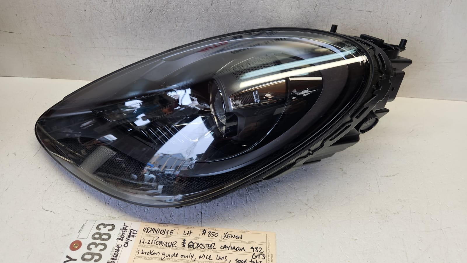 **This is an ORIGINAL FACTORY PART, not an aftermarket one.** **2017-2021 PORSCHE BOXSTER CAYMAN 982 GTS LEFT DRIVER XENON HEADLIGHT OEM** **(xenon components not included)** **DESCRIPTION:** - It will come exactly as you see on pictures. - Headlight is in **fair** **used** conditions. - **All mounting points firmly intact.** - **1 broken guide broken off, see photos #8, #9 & #10.** - **Lens clean and clear.** - Lens has some normal road wear and light scuff for been stored. - **Xenon components not included.** - Bulbs might be included on some headlights **(see pictures please)**. - Model and year is based on the of our knowledge and is 98%. Please **compare part number and pictures very carefully.** **SHIPPING INFO:** - Shipments are sent via USPS, FedEx or UPS ground. - We will only ship to confirmed addresses if paid through PayPal. - We will try to ship as soon as possible. **FEEDBACK:** - If for any reason at all you are not satisfied 100% PLEASE contact us before leaving feedback so we can rectify the situation. We are human and make mistakes too. We shoot for 100% satisfaction so please let us know how we can help you. **RETURNS:** - We will accept all returns if part does not match with description or for any reason. **Please check part number and pictures before You buy this part, We list them how they are and try to sell for the best value and best price for our costumers. For more information feel free to email me, thanks for watching and good luck.**