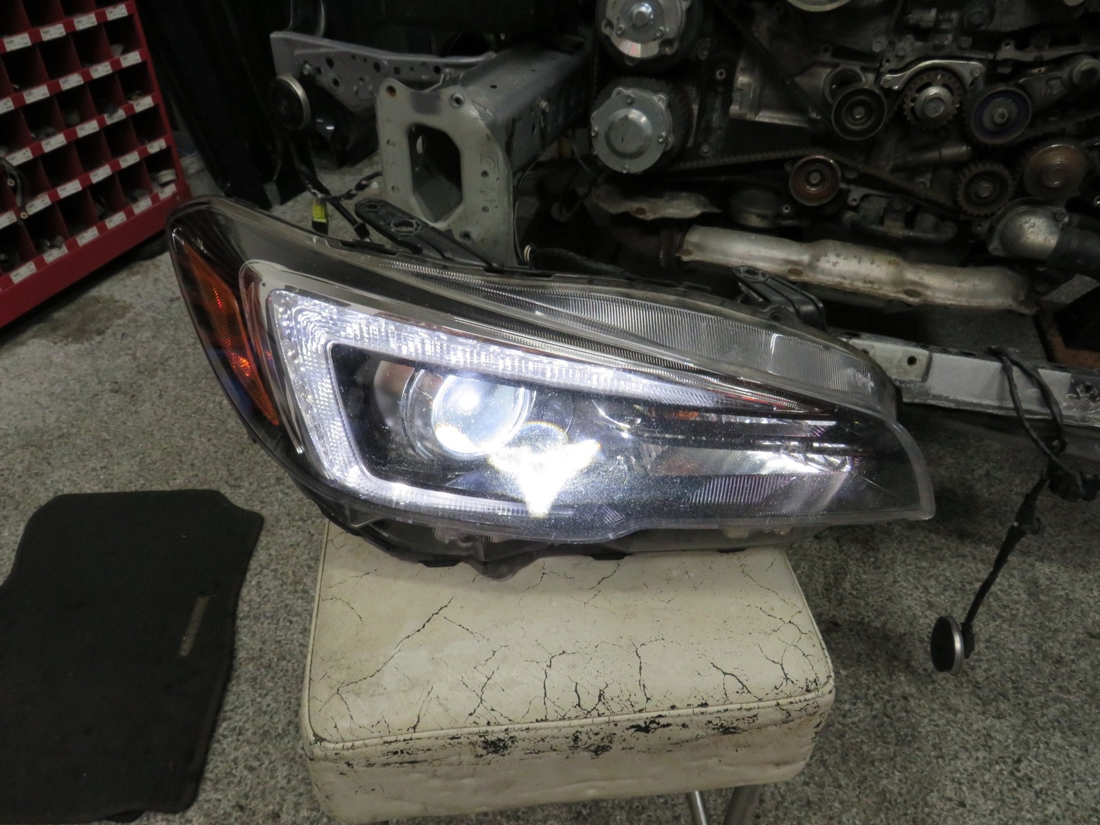 PASSENGER SIDE HEADLIGHT OUT OF 2019 SUBARU STI TWO TABS ARE DAMAGED AN THERE IS SMALL CRACK IN THE HOUSING PICTURES SHOW ACTUAL HEADLIGHT SHIPPING TO LOWER 48 STATES