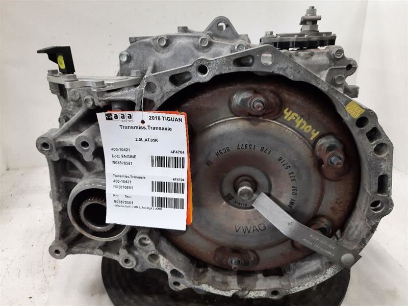 Item Description **6 MONTH WARRANTY!! 60 DAY NO HASSLE RETURNS!!** **This for a USED OEM Transmission/Transaxle Assembly pulled from a 2018 TIGUAN with 85000 actual miles on it.** **Here are our part notes about this specific part:** **2.0L,AT,85K** **Our Part #: 400-10421, 3870581** **Our Stock#: 4F4704** Please see the fitment section below to make sure this will fit your vehicle. Pay special attention to any options listed!!! In some cases, it may only fit vehicle with certain options or specific ID#s as listed below. **AUDI Q3 19-23 (AT, AWD)** **TIGUAN 18 (AT), Mexico built (VIN 3, 1st digit), AWD, (transmission ID RLU)** **TIGUAN 19 (AT), AWD, (transmission ID RLU)** **TIGUAN 20-24 (AT), AWD** Whats Included? Whats Included? FAQ/ Help Shipping Payment Returns/Warranty #### Whats Included? ``` Here is a short description of what will generally be included with your item. If you would like more information or are unsure if something will come with your item, PLEASE ASK!! A/C Compressor: Includes the clutch/pulley assembly A/C Condenser: Sensors and hoses are not included ABS Units: Include the ATTACHED electronic module unless otherwise noted Alternator: Includes the pulley. Any brackets are not included Axle/CV shaft: Does not include the axle nut Blower Motor: Include the squirrel cage/fan blade Caliper: Includes the bracket and slides. Slides are not covered under warranty Column Switch: Includes wiring (if applicable) up to the first point it can be unplugged Control Arm: Includes the ball joint and any bushings Coolant Overflow Bottle: Cap is included Cowl Vent Panel: See Our Part notes, often sold as one side only Differential Carrier: Does not include axles Door Trim Panel: Includes handle and armrest. Does not include window/lock switches Engine: Included for convenience unless otherwise noted. These parts are not covered under warranty: Intake manifold, fuel injectors, oil pan, sensors, water pump Not included: Throttle body, Turbo, wiring harness exhaust manifold (may be left on in certain cases) Exhaust Manifold: Does not include turbo where applicable Fan Assembly: Includes motors, shroud, and blades. Fuel injectors: See our part notes Fuel Filler Door: Includes hinge. Does not include bolts/hardware Fuel Pump: Includes sending unit and any molded hoses that are non-removable Headlight: Brackets are included unless otherwise noted. HID headlights include the bulbs and ballast Hub: Includes wheel studs Ignition Coil(s): See part notes Interior Rear View Mirror: Does not included bracket glued to windshield Jack: See part notes. If noted as assembly, it will include the lug wrench Mass Airflow Sensor: Does not include housing unless pictured Power Steering Pump: Includes pulley and ATTACHED reservoir. Remote reservoirs and brackets will not be included Power Steering Gear: Includes pitman arm Rack and Pinion: Includes tie rods but they are not covered under warranty Radio: Pay special attention to our fitment description. Often times radios are more than one piece and we sell them each separately Spindle/Knuckle: Does not include hub unless noted Starter: Includes solenoid Strut: Struts are left assembled and include top plate, spring, and dust boot (dust boots on used struts are rarely in perfect shape) Stabilizer Bar: Does not include links or bushings Sunvisor: Does not include clip Taillight: Pay special attention to fitment as we list the trunk lid mounted taillights as well as the corners. Does not include bulbs Temperature Control: Includes all knobs, buttons, and sliders Throttle Body: Includes sensors but they are not covered under our warranty Transmission: Automatic transmissions include torque converters and sensors. Many newer transmissions require a relearn/programming procedure. Manual transmissions do not include any part of the clutch system. Transfer Case: Does not include electric shift motor Washer Reservoir/Bottle: Includes cap unless noted Wheel/Rim: Does not include center cap, tire, or lug nuts Window Regulator: Does not include motor unless noted (most are noted with motor) Wiper Motor: Does not include arms or transmission unless noted Wiper Transmission: Does not include motor or arms unless noted ``` FAQ/ Help #### FAQ/ Help ``` Will this fit my vehicle? Is this the right part? This is the most common question that we get. The fitment information can be confusing if you don't buy replacement parts everyday. Please contact us if you are unsure!! We try to respond to questions as quickly as possible and we are more than happy to answer any questions as best as we can. In order to speed up the process, it is very helpful, but not required, for you to send us your full VIN number along with your question. It looks like its the same color as my car, how can I tell for sure? The best way is to match the manufacturer paint code. Most of the time we include the paint code in our part notes. If you don't know what a paint code is or where yours is located, please feel free to ask. We are happy to help. I only see photos of the vehicle and not the actual part you are selling. Can you send me some? Our most recent listings include actual photos when we can provide them. If you would like an actual photo, we are more than happy to take one after the purchase for your approval before the part ships. In certain cases we will take actual photos before a purchase is made. This is on a case by case basis. Send us a message and we will let you know if it is possible for us to do so I see a wheel that says it is "B" condition, what does that mean? Grading of parts is a very subjective process but we do our best to keep it uniform. Here is a brief description of wheel grades: A Condition, A-COND = This is the highest grade used wheel. It will have very minor imperfections but will be in better condition than 90% of vehicles on the road. B Condition, B-COND = This wheel will have some cosmetic imperfections. It is in average condition for the year and mileage of the 