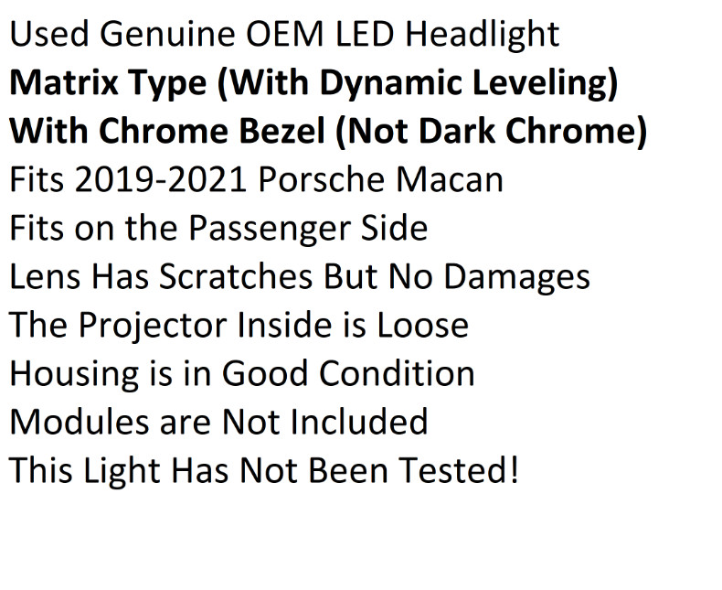 Used Genuine OEM LED Headlight **Matrix Type (With Dynamic Leveling)** **With Chrome Bezel (Not Dark Chrome)** Fits 2019-2021 Porsche Macan Fits on the Passenger Side Lens Has Scratches But No Damages The Projector Inside is Loose Housing is in Good Condition Modules are Not Included This Light Has Not Been Tested!