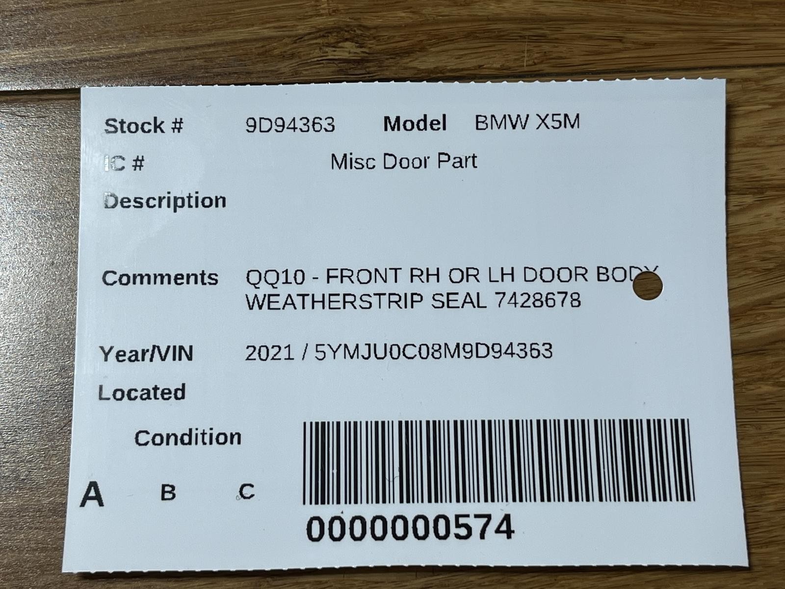 ## Vehicle Details Make / Model BMW X5MYear2021Stock Number9D94363VIN5YMJU0C08M9D94363Odometer74121 Miles Color\[WHITE\]FRONT RH OR LH DOOR BODY WEATHERSTRIP SEAL 7428678 10.20.2025 ## Information \\_\\_\\_\_\_ We are very grateful for your interest in our listing. The item you see in the photos is exactly what we offer, without any additional equipment that is not visible. Please carefully review the photos and the description of the item's condition and fitments before making a purchase to avoid any misunderstandings. The left side means the Drivers side and the Right side means the Passenger side The mileage and information about the donor's car can be found on the label in the pictures. **Shipping:** We offer fast shipping. Shipping costs for oversized items may vary depending on your location. In such cases, we'll reach out to you after the purchase to discuss delivery costs. \*If you have a commercial address please provide it before purchase and let us know if you have the forklift or a tool to remove the order from the truck. **Local Pick-up:** If you prefer local in-person pickup, it is possible. Our address is 2150 N West St, River Grove, IL 60171. Working hours: Monday - Friday \[7 am - 6 pm \] Saturday \[7 am - 12 pm\]. Please get in touch with us to arrange the pickup. **Returns:** We accept returns in accordance with return policy. You have 30 days for a potential item return. Other Parts for Your Selected Vehicle: We have many parts for the same vehicle model. If you need something else or have questions about the selected or other parts, please feel free to contact us. Thank you for trusting the City Motors Team