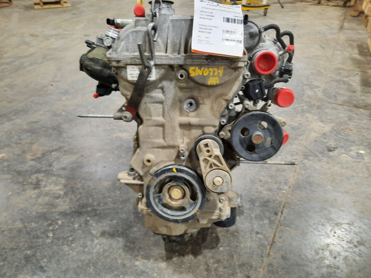 Item Description **6 MONTH WARRANTY!! 60 DAY NO HASSLE RETURNS!!** **This for a USED OEM Engine / Motor Assembly Assembly pulled from a 2019 MALIBU with 67000 actual miles on it.** **Here are our part notes about this specific part:** **1.5L,67K,WITH TURBO** **Our Part #: 300-05115B, 4275368** **Our Stock#: 5W0774** Please see the fitment section below to make sure this will fit your vehicle. Pay special attention to any options listed!!! In some cases, it may only fit vehicle with certain options or specific ID#s as listed below. **MALIBU 17 1.5L (VIN T, 8th digit, opt LFV), from 06/01/17** **MALIBU 18-22 1.5L (VIN T, 8th digit, opt LFV)** Whats Included? Whats Included? FAQ/ Help Shipping Payment Returns/Warranty #### Whats Included? ``` Here is a short description of what will generally be included with your item. If you would like more information or are unsure if something will come with your item, PLEASE ASK!! A/C Compressor: Includes the clutch/pulley assembly A/C Condenser: Sensors and hoses are not included ABS Units: Include the ATTACHED electronic module unless otherwise noted Alternator: Includes the pulley. Any brackets are not included Axle/CV shaft: Does not include the axle nut Blower Motor: Include the squirrel cage/fan blade Caliper: Includes the bracket and slides. Slides are not covered under warranty Column Switch: Includes wiring (if applicable) up to the first point it can be unplugged Control Arm: Includes the ball joint and any bushings Coolant Overflow Bottle: Cap is included Cowl Vent Panel: See Our Part notes, often sold as one side only Differential Carrier: Does not include axles Door Trim Panel: Includes handle and armrest. Does not include window/lock switches Engine: Included for convenience unless otherwise noted. These parts are not covered under warranty: Intake manifold, fuel injectors, oil pan, sensors, water pump Not included: Throttle body, Turbo, wiring harness exhaust manifold (may be left on in certain cases) Exhaust Manifold: Does not include turbo where applicable Fan Assembly: Includes motors, shroud, and blades. Fuel injectors: See our part notes Fuel Filler Door: Includes hinge. Does not include bolts/hardware Fuel Pump: Includes sending unit and any molded hoses that are non-removable Headlight: Brackets are included unless otherwise noted. HID headlights include the bulbs and ballast Hub: Includes wheel studs Ignition Coil(s): See part notes Interior Rear View Mirror: Does not included bracket glued to windshield Jack: See part notes. If noted as assembly, it will include the lug wrench Mass Airflow Sensor: Does not include housing unless pictured Power Steering Pump: Includes pulley and ATTACHED reservoir. Remote reservoirs and brackets will not be included Power Steering Gear: Includes pitman arm Rack and Pinion: Includes tie rods but they are not covered under warranty Radio: Pay special attention to our fitment description. Often times radios are more than one piece and we sell them each separately Spindle/Knuckle: Does not include hub unless noted Starter: Includes solenoid Strut: Struts are left assembled and include top plate, spring, and dust boot (dust boots on used struts are rarely in perfect shape) Stabilizer Bar: Does not include links or bushings Sunvisor: Does not include clip Taillight: Pay special attention to fitment as we list the trunk lid mounted taillights as well as the corners. Does not include bulbs Temperature Control: Includes all knobs, buttons, and sliders Throttle Body: Includes sensors but they are not covered under our warranty Transmission: Automatic transmissions include torque converters and sensors. Many newer transmissions require a relearn/programming procedure. Manual transmissions do not include any part of the clutch system. Transfer Case: Does not include electric shift motor Washer Reservoir/Bottle: Includes cap unless noted Wheel/Rim: Does not include center cap, tire, or lug nuts Window Regulator: Does not include motor unless noted (most are noted with motor) Wiper Motor: Does not include arms or transmission unless noted Wiper Transmission: Does not include motor or arms unless noted ``` FAQ/ Help #### FAQ/ Help ``` Will this fit my vehicle? Is this the right part? This is the most common question that we get. The fitment information can be confusing if you don't buy replacement parts everyday. Please contact us if you are unsure!! We try to respond to questions as quickly as possible and we are more than happy to answer any questions as best as we can. In order to speed up the process, it is very helpful, but not required, for you to send us your full VIN number along with your question. It looks like its the same color as my car, how can I tell for sure? The best way is to match the manufacturer paint code. Most of the time we include the paint code in our part notes. If you don't know what a paint code is or where yours is located, please feel free to ask. We are happy to help. I only see photos of the vehicle and not the actual part you are selling. Can you send me some? Our most recent listings include actual photos when we can provide them. If you would like an actual photo, we are more than happy to take one after the purchase for your approval before the part ships. In certain cases we will take actual photos before a purchase is made. This is on a case by case basis. Send us a message and we will let you know if it is possible for us to do so I see a wheel that says it is "B" condition, what does that mean? Grading of parts is a very subjective process but we do our best to keep it uniform. Here is a brief description of wheel grades: A Condition, A-COND = This is the highest grade used wheel. It will have very minor imperfections but will be in better condition than 90% of vehicles on the road. B Condition, B-COND = This wheel will have some cosmetic imperfections. It is in average condition for the year and mileage of the donor vehicle. It may have minor scratches and clear coat pe