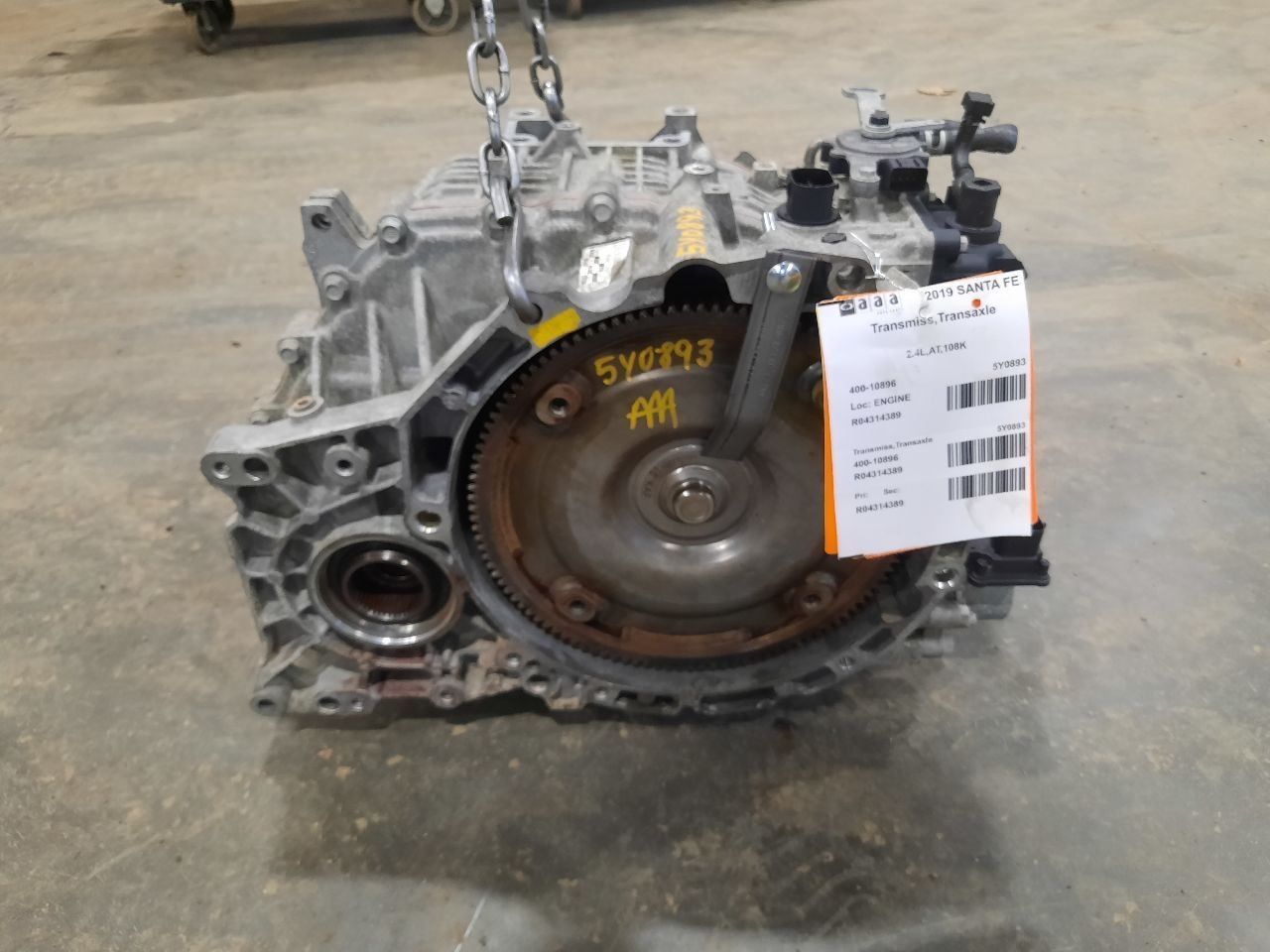 Item Description **6 MONTH WARRANTY!! 60 DAY NO HASSLE RETURNS!!** **This for a USED OEM Transmission/Transaxle Assembly pulled from a 2019 SANTA FE with 108000 actual miles on it.** **Here are our part notes about this specific part:** **2.4L,AT,108K** **Our Part #: 400-10896, 4314389** **Our Stock#: 5Y0893** Please see the fitment section below to make sure this will fit your vehicle. Pay special attention to any options listed!!! In some cases, it may only fit vehicle with certain options or specific ID#s as listed below. **SANTA FE 19 (AT), SWB, 2.4L, AWD** **SANTA FE 20 (AT), 2.4L, AWD** Whats Included? Whats Included? FAQ/ Help Shipping Payment Returns/Warranty #### Whats Included? ``` Here is a short description of what will generally be included with your item. If you would like more information or are unsure if something will come with your item, PLEASE ASK!! A/C Compressor: Includes the clutch/pulley assembly A/C Condenser: Sensors and hoses are not included ABS Units: Include the ATTACHED electronic module unless otherwise noted Alternator: Includes the pulley. Any brackets are not included Axle/CV shaft: Does not include the axle nut Blower Motor: Include the squirrel cage/fan blade Caliper: Includes the bracket and slides. Slides are not covered under warranty Column Switch: Includes wiring (if applicable) up to the first point it can be unplugged Control Arm: Includes the ball joint and any bushings Coolant Overflow Bottle: Cap is included Cowl Vent Panel: See Our Part notes, often sold as one side only Differential Carrier: Does not include axles Door Trim Panel: Includes handle and armrest. Does not include window/lock switches Engine: Included for convenience unless otherwise noted. These parts are not covered under warranty: Intake manifold, fuel injectors, oil pan, sensors, water pump Not included: Throttle body, Turbo, wiring harness exhaust manifold (may be left on in certain cases) Exhaust Manifold: Does not include turbo where applicable Fan Assembly: Includes motors, shroud, and blades. Fuel injectors: See our part notes Fuel Filler Door: Includes hinge. Does not include bolts/hardware Fuel Pump: Includes sending unit and any molded hoses that are non-removable Headlight: Brackets are included unless otherwise noted. HID headlights include the bulbs and ballast Hub: Includes wheel studs Ignition Coil(s): See part notes Interior Rear View Mirror: Does not included bracket glued to windshield Jack: See part notes. If noted as assembly, it will include the lug wrench Mass Airflow Sensor: Does not include housing unless pictured Power Steering Pump: Includes pulley and ATTACHED reservoir. Remote reservoirs and brackets will not be included Power Steering Gear: Includes pitman arm Rack and Pinion: Includes tie rods but they are not covered under warranty Radio: Pay special attention to our fitment description. Often times radios are more than one piece and we sell them each separately Spindle/Knuckle: Does not include hub unless noted Starter: Includes solenoid Strut: Struts are left assembled and include top plate, spring, and dust boot (dust boots on used struts are rarely in perfect shape) Stabilizer Bar: Does not include links or bushings Sunvisor: Does not include clip Taillight: Pay special attention to fitment as we list the trunk lid mounted taillights as well as the corners. Does not include bulbs Temperature Control: Includes all knobs, buttons, and sliders Throttle Body: Includes sensors but they are not covered under our warranty Transmission: Automatic transmissions include torque converters and sensors. Many newer transmissions require a relearn/programming procedure. Manual transmissions do not include any part of the clutch system. Transfer Case: Does not include electric shift motor Washer Reservoir/Bottle: Includes cap unless noted Wheel/Rim: Does not include center cap, tire, or lug nuts Window Regulator: Does not include motor unless noted (most are noted with motor) Wiper Motor: Does not include arms or transmission unless noted Wiper Transmission: Does not include motor or arms unless noted ``` FAQ/ Help #### FAQ/ Help ``` Will this fit my vehicle? Is this the right part? This is the most common question that we get. The fitment information can be confusing if you don't buy replacement parts everyday. Please contact us if you are unsure!! We try to respond to questions as quickly as possible and we are more than happy to answer any questions as best as we can. In order to speed up the process, it is very helpful, but not required, for you to send us your full VIN number along with your question. It looks like its the same color as my car, how can I tell for sure? The best way is to match the manufacturer paint code. Most of the time we include the paint code in our part notes. If you don't know what a paint code is or where yours is located, please feel free to ask. We are happy to help. I only see photos of the vehicle and not the actual part you are selling. Can you send me some? Our most recent listings include actual photos when we can provide them. If you would like an actual photo, we are more than happy to take one after the purchase for your approval before the part ships. In certain cases we will take actual photos before a purchase is made. This is on a case by case basis. Send us a message and we will let you know if it is possible for us to do so I see a wheel that says it is "B" condition, what does that mean? Grading of parts is a very subjective process but we do our best to keep it uniform. Here is a brief description of wheel grades: A Condition, A-COND = This is the highest grade used wheel. It will have very minor imperfections but will be in better condition than 90% of vehicles on the road. B Condition, B-COND = This wheel will have some cosmetic imperfections. It is in average condition for the year and mileage of the donor vehicle. It may have minor scratches and clear coat peeling. This is still a fairly nice looking, used 