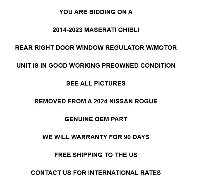 <span style="font-size: 14pt; font-family: Arial;"><font rwr="1" size="4" style="font-family:Arial"></font></span><blockquote dir="ltr" style="margin-right: 0px;"><font face="Arial" rwr="1" size="6" style=""><b> </b></font><blockquote dir="ltr" style="margin-right: 0px;"><font face="Arial" rwr="1" size="6" style=""><b> </b></font><blockquote dir="ltr" style="margin-right: 0px;"><font face="Arial" rwr="1" size="6" style=""><b> </b></font><blockquote dir="ltr" style="margin-right: 0px;"><font face="Arial" rwr="1" size="6" style=""><b> </b></font><blockquote dir="ltr" style="margin-right: 0px;"><font face="Arial" rwr="1" size="6" style=""><b> </b></font><blockquote dir="ltr" style="margin-right: 0px;"><font face="Arial" rwr="1" size="6" style=""><b> </b></font><blockquote dir="ltr" style="margin-right: 0px;"><font face="Arial" rwr="1" size="6" style=""><b> </b></font><blockquote dir="ltr" style="margin-right: 0px;"><font face="Arial" rwr="1" size="6" style=""><b> </b><p></p></font><p align="center" class="MsoNormal" style="font-size: 14pt; font-family: Arial; text-align: center; line-height: normal;"></p><p style="font-size: 14pt; font-family: Arial;"><font size="6"><strong></strong></font></p><table align="center" cellpadding="0" cellspacing="0" frame="void" rules="groups" style="text-align: left; border-collapse: collapse;" width="780"><tbody><tr valign="top"><td class="edge"></td></tr></tbody></table><p style=""></p></blockquote></blockquote></blockquote></blockquote></blockquote></blockquote></blockquote><i style=""><div style="text-align: center;"><i><strong><u><strong><font face="Arial" size="6">LANSDOWNE MOTORSPORT</font></strong></u></strong></i></div></i><blockquote dir="ltr" style="margin-right: 0px;"><blockquote dir="ltr" style="margin-right: 0px;"><blockquote dir="ltr" style="margin-right: 0px;"><blockquote dir="ltr" style="margin-right: 0px;"><blockquote dir="ltr" style="margin-right: 0px;"><blockquote dir="ltr" style="margin-right: 0px;"></blockquote></blockquote></blockquote></blockquote></blockquote></blockquote><u style=""><div style="text-align: center;"><u><strong><font face="Arial" size="6">160 E. PLUMSTEAD AVE, LANSDOWNE PA 19050</font></strong></u></div></u><table align="center" style="text-align: center;" width="375"><tbody><tr style=""><td></td><td align="right"></td><td align="right"><p><strong style="font-family: Arial; font-size: xx-large; text-align: center;"> </strong></p></td></tr></tbody></table><blockquote dir="ltr" style="margin-right: 0px;"><blockquote dir="ltr" style="margin-right: 0px;"><blockquote dir="ltr" style="margin-right: 0px;"><blockquote dir="ltr" style="margin-right: 0px;"><blockquote dir="ltr" style="margin-right: 0px;"><blockquote dir="ltr" style="margin-right: 0px;"><blockquote dir="ltr" style="margin-right: 0px;"><p><i style=""><strong><font style=""><font face="Arial" size="6"></font></font></strong></i></p></blockquote></blockquote></blockquote></blockquote></blockquote></blockquote></blockquote><table align="center" cellpadding="0" cellspacing="0" frame="void" rules="groups" style="text-align: center; border-collapse: collapse;" width="780"><tbody><tr valign="top"><td class="edge_inside"><table border="0" cellpadding="0" cellspacing="0" width="100%"></table></td></tr></tbody></table><div style="text-align: center;"><strong style=""><font face="Arial" size="6" style="">YOU ARE BIDDING ON A</font></strong></div><div style="text-align: center;"><strong style=""><font face="Arial" size="6"><br></font></strong></div><div style="text-align: center;"><font face="Arial" size="6"><strong>2014-2023 MASERATI GHIBLI</strong></font></div><div style="text-align: center;"><font face="Arial" size="6"><strong><br></strong></font></div><div style="text-align: center;"><font face="Arial" size="6"><strong>REAR RIGHT DOOR WINDOW REGULATOR W/MOTOR</strong></font></div><div style="text-align: center;"><font face="Arial" size="6"><strong><br></strong></font></div><div style="text-align: center;"><font face="Arial" size="6"><strong>UNIT IS IN GOOD WORKING PREOWNED CONDITION</strong></font></div><div style="text-align: center;"><font face="Arial" size="6"><strong><br></strong></font></div><div style="text-align: center;"><font face="Arial" size="6"><strong>SEE ALL PICTURES</strong></font></div><div style="text-align: center;"><font face="Arial" size="6"><strong><br></strong></font></div><div style="text-align: center;"><font face="Arial" size="6"><b>REMOVED FROM A 2024 NISSAN ROGUE</b></font></div><div style="text-align: center;"><font face="Arial" size="6"><strong><br></strong></font></div><div style="text-align: center;"><font face="Arial" size="6"><strong>GENUINE OEM PART</strong></font></div><div style="text-align: center;"><font face="Arial" size="6"><strong><br></strong></font></div><div style="text-align: center;"><font face="Arial" size="6"><strong>WE WILL WARRANTY FOR 90 DAYS</strong></font></div><div style="text-align: center;"><strong style=""><font face="Arial" size="6"><br></font></strong></div><div style="text-align: center;"><strong style=""><font face="Arial" size="6">FREE SHIPPING TO THE US</font></strong></div><div style="text-align: center;"><strong style=""><font face="Arial" size="6"><br></font></strong></div><div style="text-align: center;"><strong style=""><font face="Arial" size="6">CONTACT US FOR INTERNATIONAL RATES</font></strong></div></blockquote><div style="text-align: center;"><strong style=""><font face="Arial" size="6"><br></font></strong></div><div style="font-style: italic; text-align: center;"><br></div><blockquote dir="ltr" style="font-size: 14pt; font-family: Arial; margin-right: 0px;"><blockquote dir="ltr" style="margin-right: 0px;"><blockquote dir="ltr" style="margin-right: 0px;"><blockquote dir="ltr" style="font-family: Arial; font-size: 14pt; margin-right: 0px;"><font size="5"><strong></strong></font></blockquote></blockquote></blockquote></blockquote>