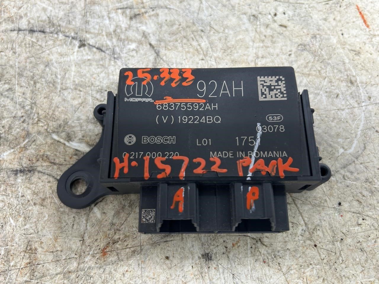 All used modules must be reprogrammed. These are not going to be plug and play. Please confirm compatibility prior to purchasing. Thanks and Buy With Confidence!!! Donor Vehicle Model : GRANDCHER Year : 2021 Mileage : 77000 (0 = not available or unknown) Stock Number : 25333 Notes : 68375592AH,PARK ASST,WO SVM 4/11 This Part Will Fit These Makes And Models With These Options GRAND CHEROKEE 21 Driver Assist; WL body (VIN J or K, 6th digit), (park assist), w/surround view GRAND CHEROKEE 22 Driver Assist; WL body (VIN G, H, Y, J or K, 6th digit), park assist, w/surround view GRAND CHEROKEE 23 Driver Assist; park assist, w/surround view About UsPaymentShippingReturnsWarranty About Us We are happy to verify fitment for you prior to purchase via your vehicle’s VIN (Vehicle Identification Number). Please contact us with any questions prior to purchasing. Orders are sent to the shipping department throughout the day therefore we cannot guarantee adjustments to orders after payment is received. **Parts Grading** A standard code system is used to communicate the condition and quality of a part between automotive recyclers, automotive repair shops, and insurers. Knowing how these codes are used will help you understand whether the part meets your expectations before you buy it and what you can expect from the part when you receive it. **A Grade**\- The highest quality part. It is of low miles and/or exceptional condition for its age. **B Grade**\- The second level quality part. It is of average miles and normal condition for its age. **C Grade**\- The third level quality part. It has high miles and/or light damage. **No Grade**\- A part that has not yet been graded. Payment All orders must be paid in full prior to shipment. We accept credit card and cash for Local Pickup orders. If payment is not received, an Unpaid Item case will be opened for the sake of seller fee reimbursement. Shipping Items are shipped after receiving cleared payment. We ship to US addresses within the continental 48 states. Shipping to AK, HI, PO Box, APO, FPO & US Protectorates: please contact first as we may be able to arrange shipping for an additional charge (depending on the part). Freight items must have a commercial address and part fitment must be verified via VIN prior to shipment. Returns All parts must be returned in their original condition to receive full credit. Please message us with questions. Warranty All parts come with a standard warranty, please contact us for details prior to ordering. Timeframe is listed within the Warranty section of the listing for each part. Warranty claims must be made with our warranty department, details will be included with the packing slip for each order. Labor and costs associated with part installation are not included in the warranty, parts only.   Copyright © 2022, All Rights Reserved. Copyright © 2022, All rights reserved. Design & Developed By : eFusionWorld