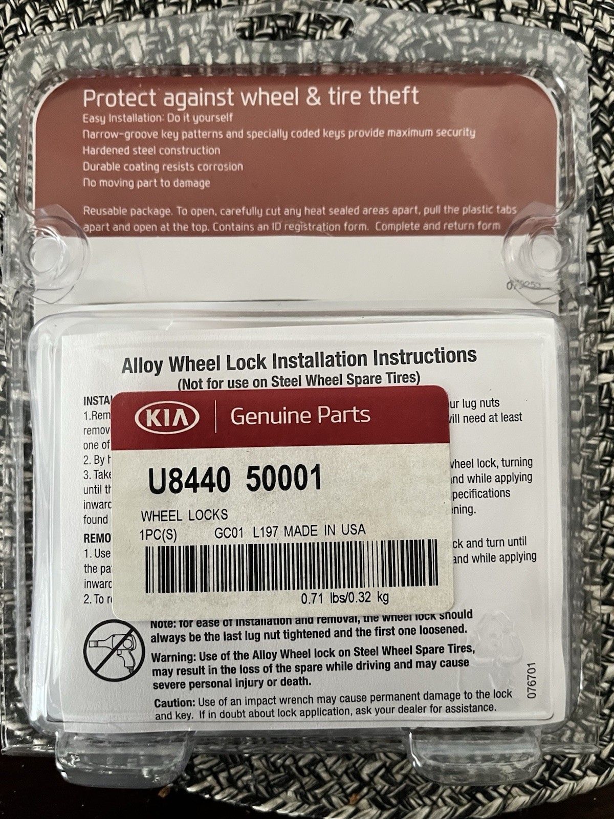 Genuine Kia Wheel Locks U844050001, the Right Choice Your vehicle deserves only genuine OEM Kia parts and accessories. To ensure reliability, purchase Kia part # U844050001 Wheel Locks. It is sometimes referred to as Kia Wheel Locks. Kia parts and accessories are expedited directly from authorized Kia dealers strategically located all across the U.S. and are backed by the manufacturer's 12 month, 12,000 mile warranty. OEM Kia parts are the best for restoring your vehicle to factory condition performance. This part fits 2021-2022 Kia K5, 2021-2023 Kia Sorento, 2020-2023 Kia Soul, 2020-2022 Kia Sportage. Affordable, reliable and built to last, Kia part # U844050001 Wheel Locks stands out as the smart option. KiaPartsNow.com is your prime online source with the biggest and best selection of genuine Kia parts and accessories at giant discounted prices.