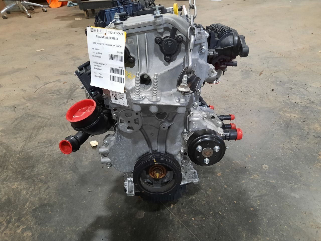 Item Description **6 MONTH WARRANTY!! 60 DAY NO HASSLE RETURNS!!** **This for a USED OEM Engine / Motor Assembly Assembly pulled from a 2024 ESCAPE with 3000 actual miles on it.** **Here are our part notes about this specific part:** **1.5L,3K,WITH TURBO,RAN GOOD** **Our Part #: 300-10860, 4080005** **Our Stock#: 5P0167** Please see the fitment section below to make sure this will fit your vehicle. Pay special attention to any options listed!!! In some cases, it may only fit vehicle with certain options or specific ID#s as listed below. **ESCAPE 23-24 1.5L (VIN N, 8th digit, turbo)** Whats Included? Whats Included? FAQ/ Help Shipping Payment Returns/Warranty #### Whats Included? ``` Here is a short description of what will generally be included with your item. If you would like more information or are unsure if something will come with your item, PLEASE ASK!! A/C Compressor: Includes the clutch/pulley assembly A/C Condenser: Sensors and hoses are not included ABS Units: Include the ATTACHED electronic module unless otherwise noted Alternator: Includes the pulley. Any brackets are not included Axle/CV shaft: Does not include the axle nut Blower Motor: Include the squirrel cage/fan blade Caliper: Includes the bracket and slides. Slides are not covered under warranty Column Switch: Includes wiring (if applicable) up to the first point it can be unplugged Control Arm: Includes the ball joint and any bushings Coolant Overflow Bottle: Cap is included Cowl Vent Panel: See Our Part notes, often sold as one side only Differential Carrier: Does not include axles Door Trim Panel: Includes handle and armrest. Does not include window/lock switches Engine: Included for convenience unless otherwise noted. These parts are not covered under warranty: Intake manifold, fuel injectors, oil pan, sensors, water pump Not included: Throttle body, Turbo, wiring harness exhaust manifold (may be left on in certain cases) Exhaust Manifold: Does not include turbo where applicable Fan Assembly: Includes motors, shroud, and blades. Fuel injectors: See our part notes Fuel Filler Door: Includes hinge. Does not include bolts/hardware Fuel Pump: Includes sending unit and any molded hoses that are non-removable Headlight: Brackets are included unless otherwise noted. HID headlights include the bulbs and ballast Hub: Includes wheel studs Ignition Coil(s): See part notes Interior Rear View Mirror: Does not included bracket glued to windshield Jack: See part notes. If noted as assembly, it will include the lug wrench Mass Airflow Sensor: Does not include housing unless pictured Power Steering Pump: Includes pulley and ATTACHED reservoir. Remote reservoirs and brackets will not be included Power Steering Gear: Includes pitman arm Rack and Pinion: Includes tie rods but they are not covered under warranty Radio: Pay special attention to our fitment description. Often times radios are more than one piece and we sell them each separately Spindle/Knuckle: Does not include hub unless noted Starter: Includes solenoid Strut: Struts are left assembled and include top plate, spring, and dust boot (dust boots on used struts are rarely in perfect shape) Stabilizer Bar: Does not include links or bushings Sunvisor: Does not include clip Taillight: Pay special attention to fitment as we list the trunk lid mounted taillights as well as the corners. Does not include bulbs Temperature Control: Includes all knobs, buttons, and sliders Throttle Body: Includes sensors but they are not covered under our warranty Transmission: Automatic transmissions include torque converters and sensors. Many newer transmissions require a relearn/programming procedure. Manual transmissions do not include any part of the clutch system. Transfer Case: Does not include electric shift motor Washer Reservoir/Bottle: Includes cap unless noted Wheel/Rim: Does not include center cap, tire, or lug nuts Window Regulator: Does not include motor unless noted (most are noted with motor) Wiper Motor: Does not include arms or transmission unless noted Wiper Transmission: Does not include motor or arms unless noted ``` FAQ/ Help #### FAQ/ Help ``` Will this fit my vehicle? Is this the right part? This is the most common question that we get. The fitment information can be confusing if you don't buy replacement parts everyday. Please contact us if you are unsure!! We try to respond to questions as quickly as possible and we are more than happy to answer any questions as best as we can. In order to speed up the process, it is very helpful, but not required, for you to send us your full VIN number along with your question. It looks like its the same color as my car, how can I tell for sure? The best way is to match the manufacturer paint code. Most of the time we include the paint code in our part notes. If you don't know what a paint code is or where yours is located, please feel free to ask. We are happy to help. I only see photos of the vehicle and not the actual part you are selling. Can you send me some? Our most recent listings include actual photos when we can provide them. If you would like an actual photo, we are more than happy to take one after the purchase for your approval before the part ships. In certain cases we will take actual photos before a purchase is made. This is on a case by case basis. Send us a message and we will let you know if it is possible for us to do so I see a wheel that says it is "B" condition, what does that mean? Grading of parts is a very subjective process but we do our best to keep it uniform. Here is a brief description of wheel grades: A Condition, A-COND = This is the highest grade used wheel. It will have very minor imperfections but will be in better condition than 90% of vehicles on the road. B Condition, B-COND = This wheel will have some cosmetic imperfections. It is in average condition for the year and mileage of the donor vehicle. It may have minor scratches and clear coat peeling. This is still a fairly nice looking, used wheel C C