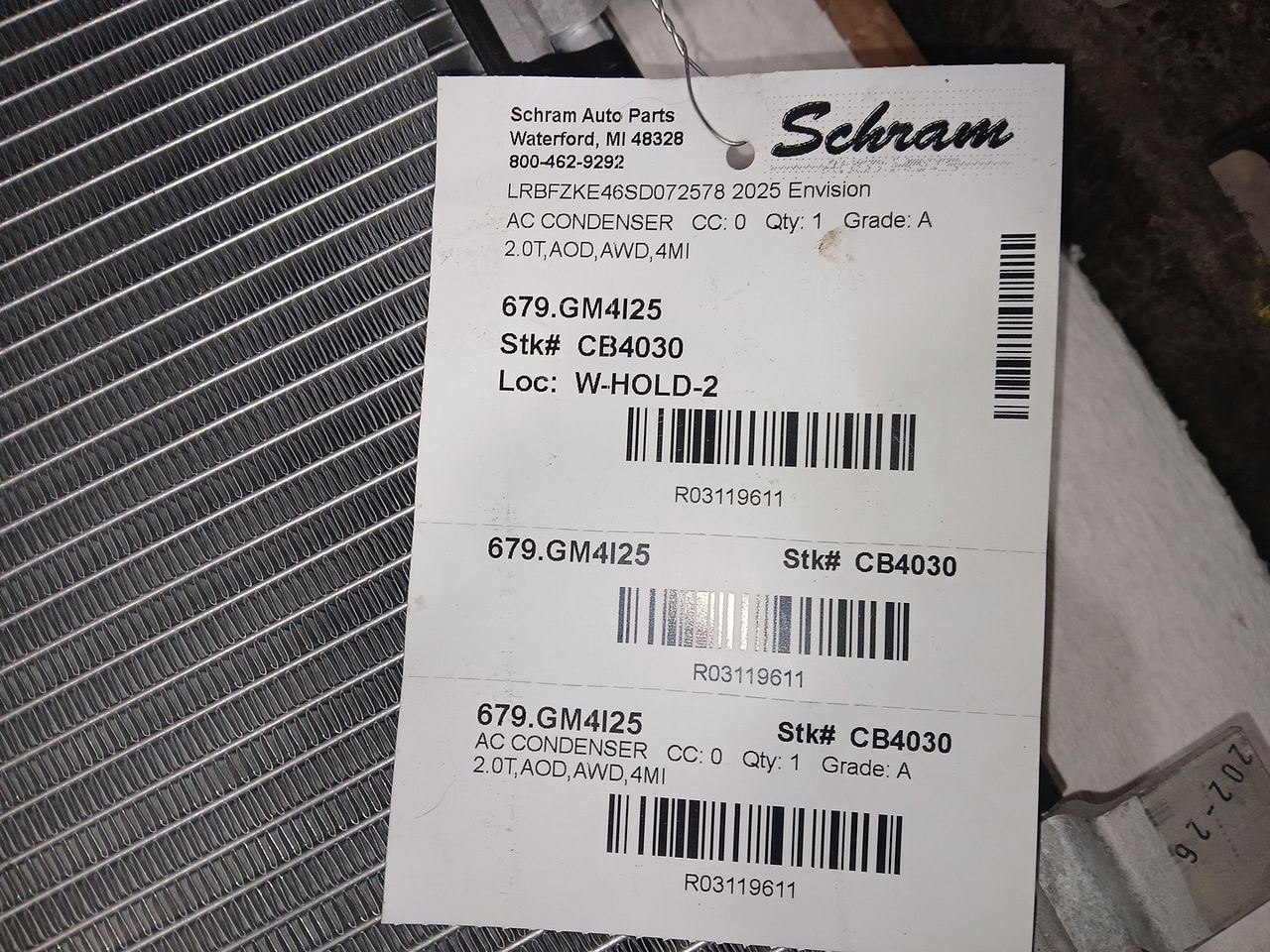 1923   Description 2.0T,AOD,AWD,4MI Mileage: 0 This item will fit the following vehicles/applications: **OEM AC Condenser – Factory Original** This listing is for an **AC Condenser** removed from a vehicle and professionally tested to ensure proper functionality. If unsure, check with your dealer using your VIN. **Condition:** Used and guaranteed working. This AC Condenser was removed from a running vehicle and has passed our inspection process. Expect normal wear from use, such as light bent fins or surface dust. We’re here to assist you and ensure you get the correct part. **Choose Schram Auto Parts – Trusted since 1923.** Vehicle 2025 Envision Mileage 0 Part Grade A What's this?