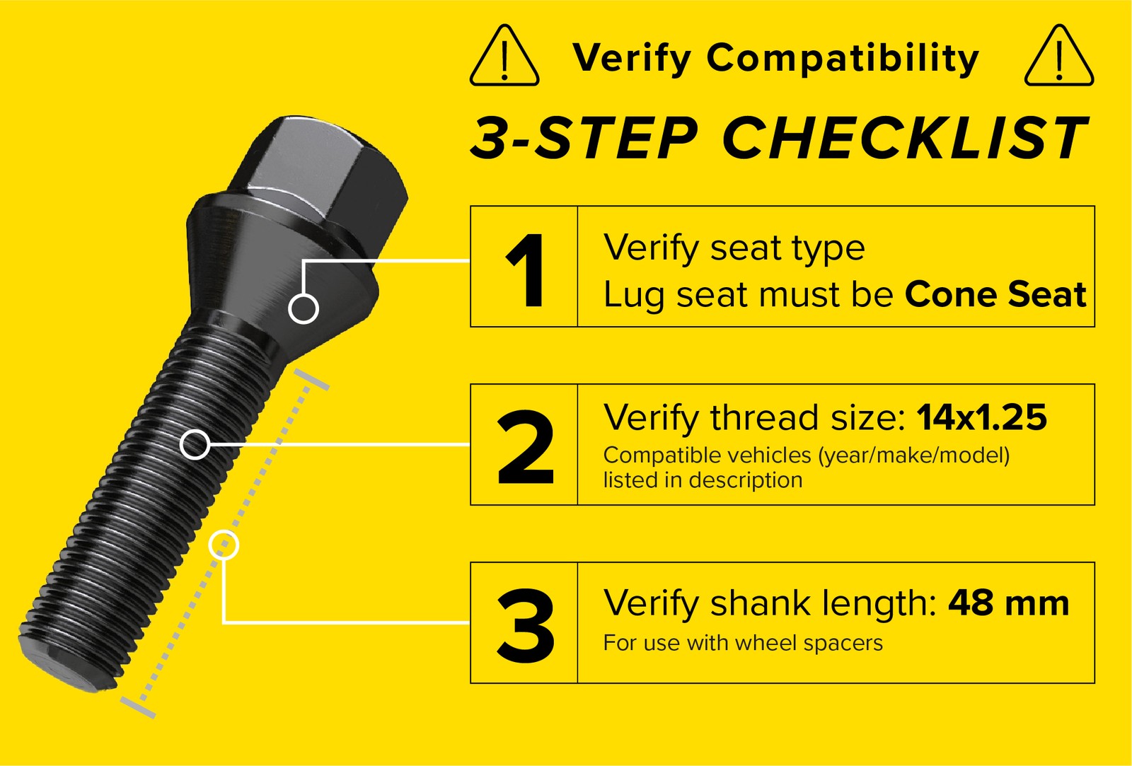 These lug bolts only work on vehicles with the following thread size/pitch: 14x1.25 \| 14mmx1.25 \| M14x1.25 \| 14x1.25mm \| UNF RH. Buyers need to ensure their wheels have Cone Seat (60 Degree Taper) lug holes. Buyers also need to verify that the 48mm shank length is correct for their application. We cannot know what shank length you need, so it is important for buyers to take proper measurements. Please click into this section to view important fitment information and additional details about the item. This is an extended length lug bolt, NOT an OEM replacement lug bolt. NOT to be used without wheel spacers. The correct length will depend on your OEM bolt's length and the spacer's thickness. See Diagram for Measuring Help. MEASURE BEFORE PURCHASING. Installing bolts that are too short can cause them to fall out while driving. Installing bolts that are too long may damage brake components. - WARNING: VERIFY VEHICLE LUG BOLT SIZE, SEAT AND THREADS. Check your vehicle's bolt thread size, as various years/models come with different size bolts. These are Cone Seat (60 Degree Taper) shaped bolts. Make sure your wheels bolt seat have this seat type. See Diagram for Help. During Installation, ensure that your bolts get 5-8 full turns before tightening. - \[SPECIFICATIONS\] Pack of 20 - Black Bolts \| Thread Size: 14x1.25 \| Seat Type: Cone Seat (60 Degree Taper) \| Shank Length: 48mm (ie thread length). - MANUFACTURING: Made with cold forged steel. Machine precision threads ensure the best fit on your vehicle's hub. Zinc coating provides exceptional corrosion/rust resistance and appearance. Additional Heat Treating Process ensures dependable strength, durability, and performance. - FITMENT: Only Compatible with BMW, years 2013 and newer. Compatible with BMW 2014+ 2-Series (F22); 2013+ 3-Series (F30, G20); 2014+ 4-Series; 2012+ 5-Series (F10, G30); 2012+ 6-Series & 7-Series. Also compatible with BMW 2014+ M3, M4; 2012+ M5, M6; 2012+ X1, X2, X3, X4, X5, X6; 2014+ i3; 2014+ i8. NOTE: Some come with different size/thread lug bolts. IMPORTANT to read Description Section for specific years and models. > **Item Condition** > **Information** > > Lug bolts are in perfect working condition. Bolts have cosmetic blemishes (nicks / scuffs / scratches), but this does not affect its use. * * * > **Important Note About** > **Pictures** > > Please note that the pictures depicts a "new" product and will not be the actual > item you will receive. If you have any questions or concerns, please > message us. * * * QuantitySet of Twenty (20) Lug BoltsThread Size14x1.25Seat TypeCone Seat (60 Degree Taper)Shank Length48mmGrade10.9 Grade (Factory OEM)Hex Size17mmMaterialSteel (Heat Treated)FinishBlack zinc plated (Prevents Rust & Corrosion) ## **FITMENT INFORMATION** **How do I determine what Shank Length I need?** 1) Measure shank length of OEM bolt (Threaded portion, starting at end of the seat to the end of the bolt) 2) Measure the thickness of the spacer you will be using (if not using a spacer, then this measurement is zero) 3) Add measurements from step 1 and step 2. And that is the shank length you need **What is the difference between Cone and Ball seat?** This is determined by your wheel's lug seat. The seat of the bolt refers to the part of the bolt that makes contact with the wheel's lug seat. The most common seats are Cone (conical / tapered) and Ball (radius / rounded). Cone type features a straight taper seat, whereas Ball type features a curved seat. The buyer is ultimately responsible for taking proper measurements and ensuring they are choosing the correct length bolt for their application Before purchasing, check the **Thread Size**, **Seat Type**, and **Shank Length** to ensure it matches your vehicle's specs. View Diagram above. And see the Important Notes tab below for more details. Important Notes Important Notes Legal Disclaimer #### Important Notes ``` FINAL SALE ITEM - Cannot be returned/exchanged. It is extremely important for you to double check fitment and the notes below before purchasing. Before Purchasing Verify Thread Size - If your vehicle is not shown as compatible above, it is the buyer's responsibility to ensure they are purchasing the correct thread size. Verify Shank Length - It is crucial for buyers to measure their OEM lug bolt shank length. It is not possible for us to guarantee fitment of this for your vehicle since we do not know if you are using a wheel spacer, and what size that spacer is. Verify Seat Type - Wheel Lug Holes have either cone seat or ball seat. It's impossible for us to know what you have. Therefore, it is the buyer's responsibility to verify the seat of this bolt matches their wheels. Questions? Need Help? We are here to answer your questions. Message us if you are not 100% sure about fitment, shank length, or seat type. Installation Professional Installation Recommended Be sure to torque the lug bolts to the vehicle manufacturer specifications Avoid using an impact wrench; improper usage may cause damage to components Check and re-torque after 25-50 miles of driving ``` Legal Information #### Legal Information ``` NOTE: This is an aftermarket component. The vehicle makes/models used in this listing are registered trademarks of their respective owners, and are used in this listing to identify compatibility. ``` More Items!