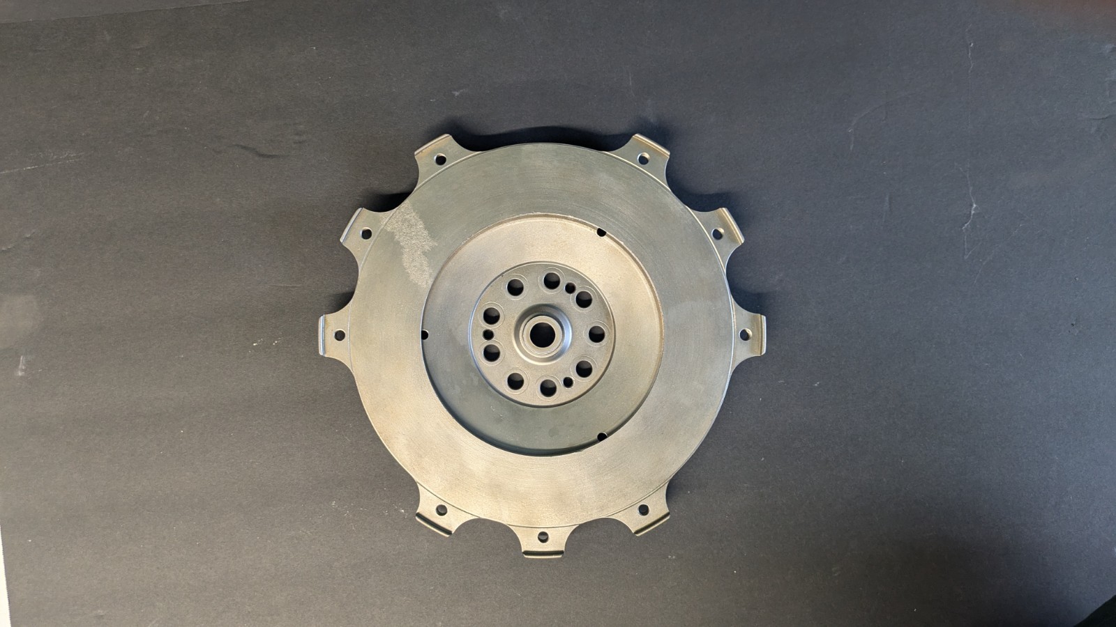 Used lightened RSR type flywheel for use on select Porsche engine equipped race vehicles. Approximately 8.45 lbs Note: This uses a 240mm clutch disc and a 9-bolt crankshaft. Does not have a pilot bearing installed. Scalloped without a timing reference. Has superficial pitting/rust present throughout. Bare steel and unpainted. Race track use only Shelf G-2