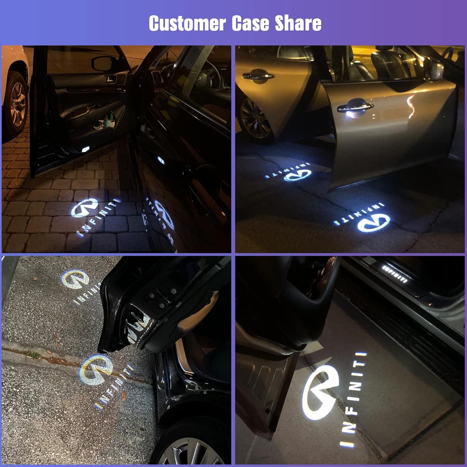 **Introduction:** If you are looking for away to set your new car apart from the rest. Courtesy Ghost Projector Lamp is the way to go. **Wide Compatibility – Designed to fit:** QX50 2014~2022 QX56 2011~2013 QX60 2019~2024 QX70 2014~2020 QX80 2014~2022 Q50 2014~2022(2016 Except) Q60 2014~2022 Q70 2014~2019 M35 2006~2010 M37 2011~2013 EX35 2008~2012 EX37 2013 **Package Included:** 2Pcs CAR DOOR LED LIGHT **Simple Installation** \- Plug and Play Does not require any wiring or new holes! Please check carefully the year and model of your car before place order!