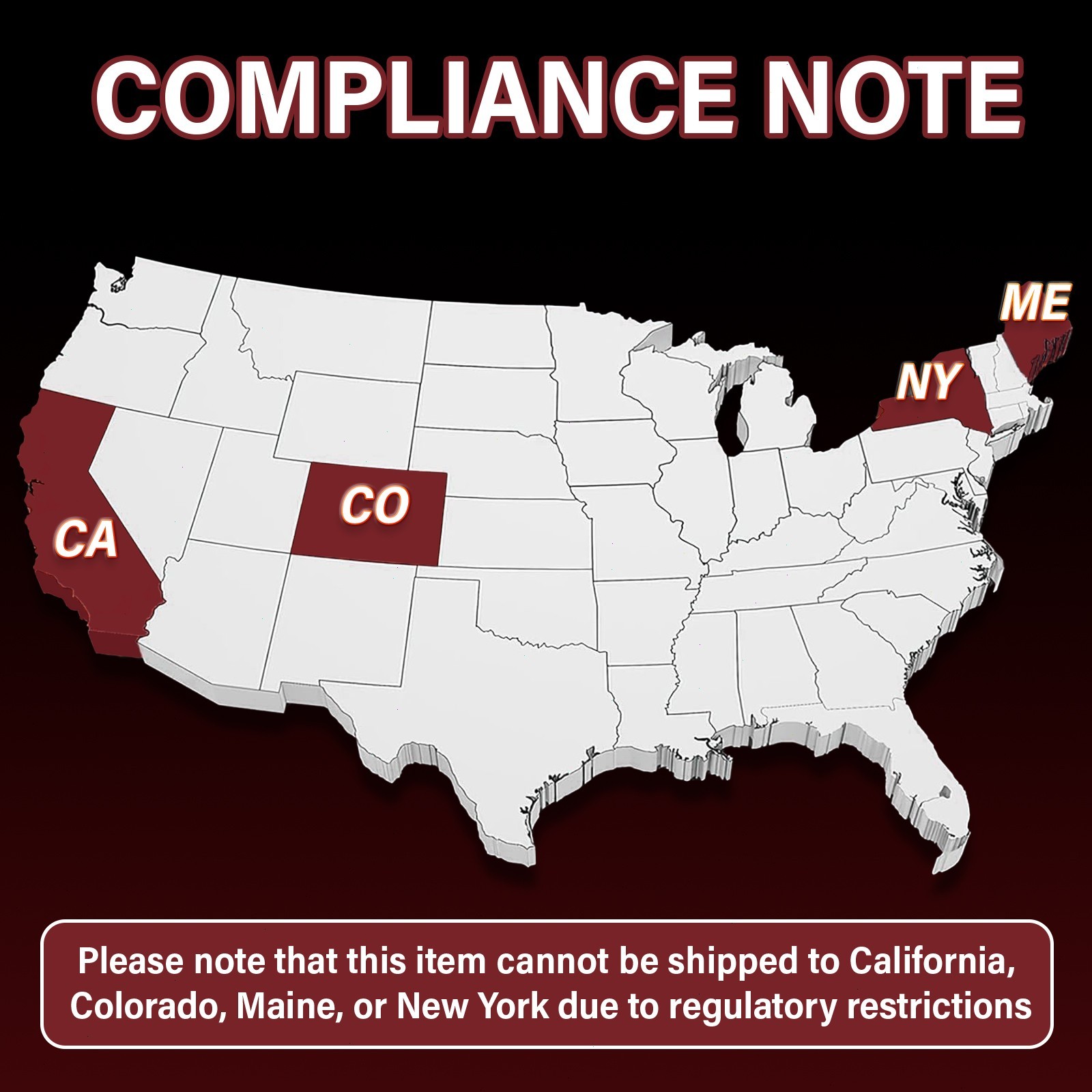 - Restricted States: California,New York,Colorado & Maine
