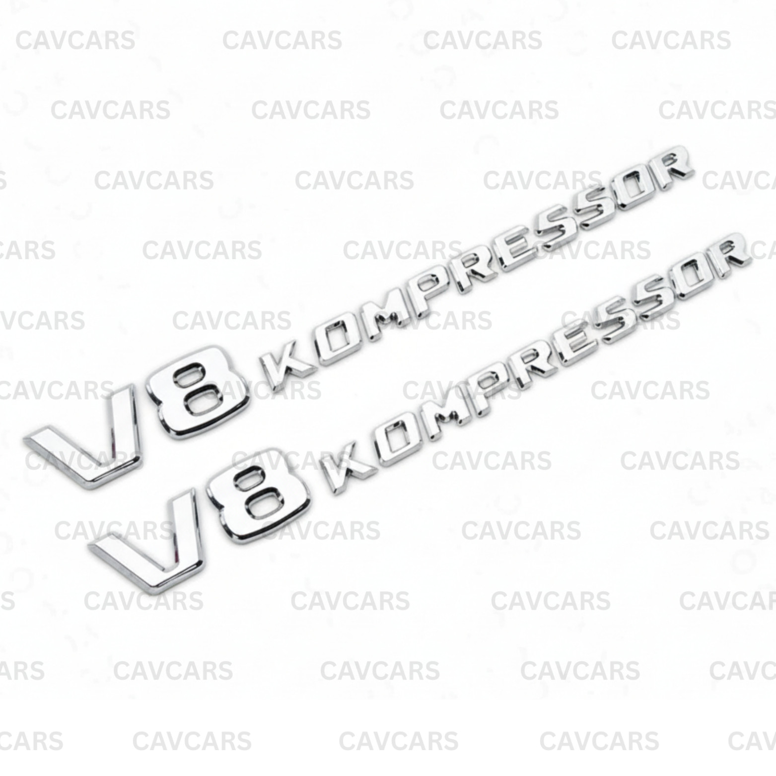 ## PRODUCT HIGHLIGHTS - V8 KOMPRESSOR emblem badge set – 2 pieces included - Designed for Mercedes Benz models including W220, W230, W211, and more - Chrome silver finish for a clean factory-style appearance - Ideal for fender or side placement - Enhances exterior styling with a sporty, premium look ## COLOR - Color: Chrome Silver - Finish: Smooth, high-shine surface ## PACKAGE CONTENTS (2) V8 KOMPRESSOR emblem badges. ## VEHICLE COMPATIBILITY Fits Mercedes Benz models including W220, W230, W211, W203, W463, and other compatible models. Please verify placement and fitment before installation. ## CONDITION Absolutely no flaw ## SHIPPING & RETURNS Same-day shipping for orders placed before 5:00 PM PT. Orders placed after 5:00 PM PT ship the next business day. Free shipping to the United States, Hawaii, Puerto Rico, and the Virgin Islands. Hassle-free 30-day returns or replacements.