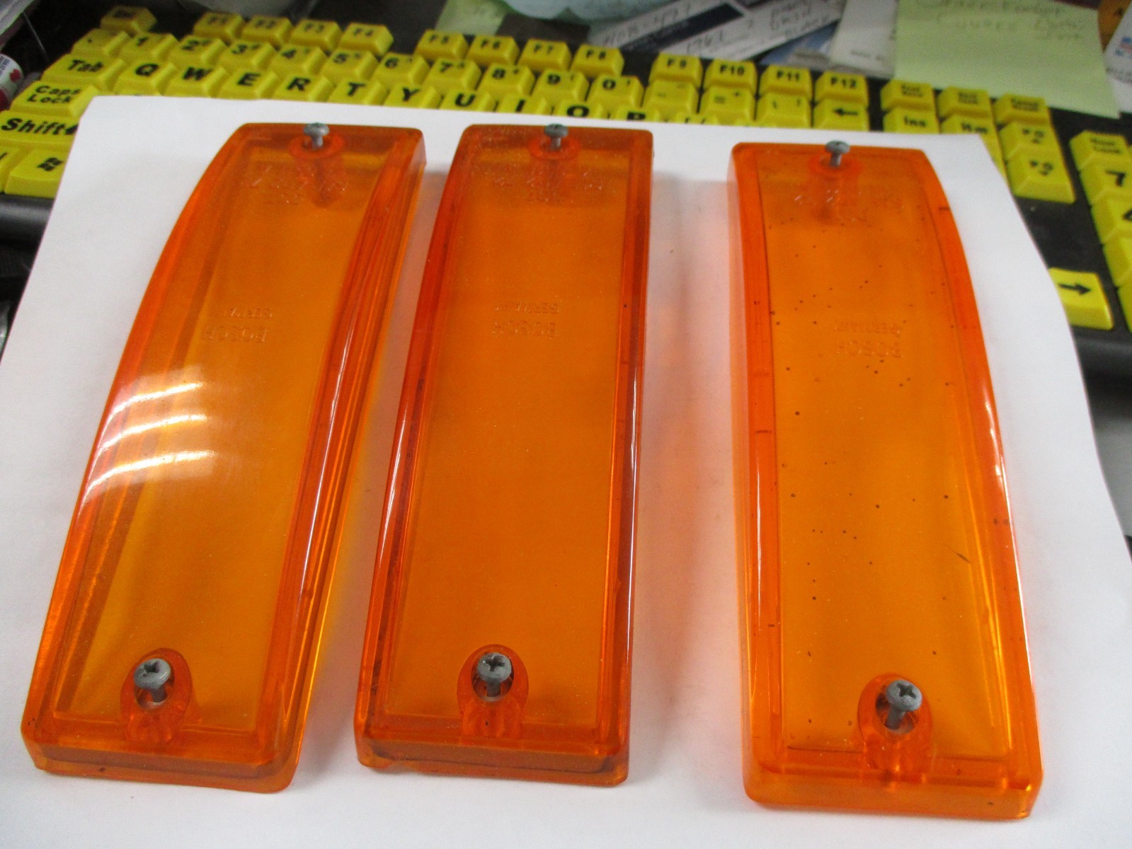 This product is a set of three original BOSCH front turn signal lenses for a Porsche 911. The lenses are orange and amber in color, and are considered vintage parts. They are designed for placement on the front of the vehicle, specifically the left and right sides. The manufacturer Part Number is KL 0511 A, and they come with no warranty. Perfect for vintage Porsche enthusiasts looking to replace their existing turn signal lenses with high-quality, authentic BOSCH parts. YOUR CHOICE #1 OR #2 OR #3! QUESTIONS?