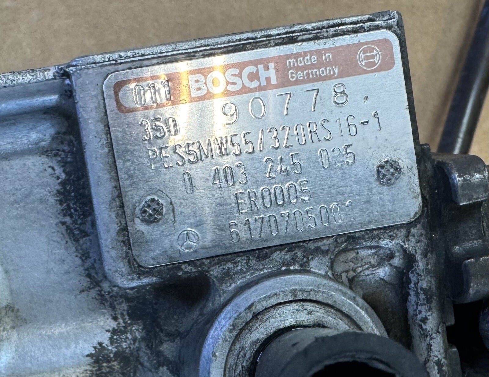 300D 300SD Turbo Diesel Fuel Injection Pump 0403245025 / PES5MW55/320RS16-1. Diesel Injection Pump off a Mercedes 1985 300SD Bosch Part Number : pes5mw55 / 320rs 16-1 Bosch Part Number : 0 403 245 025 Mercedes Part Number : 617 070 50 01 Fits 1984 and 1985 Turbo Diesel engines from 300D 300SD 300TD and 300CD that use the electronic rack damper on the back of the pump.