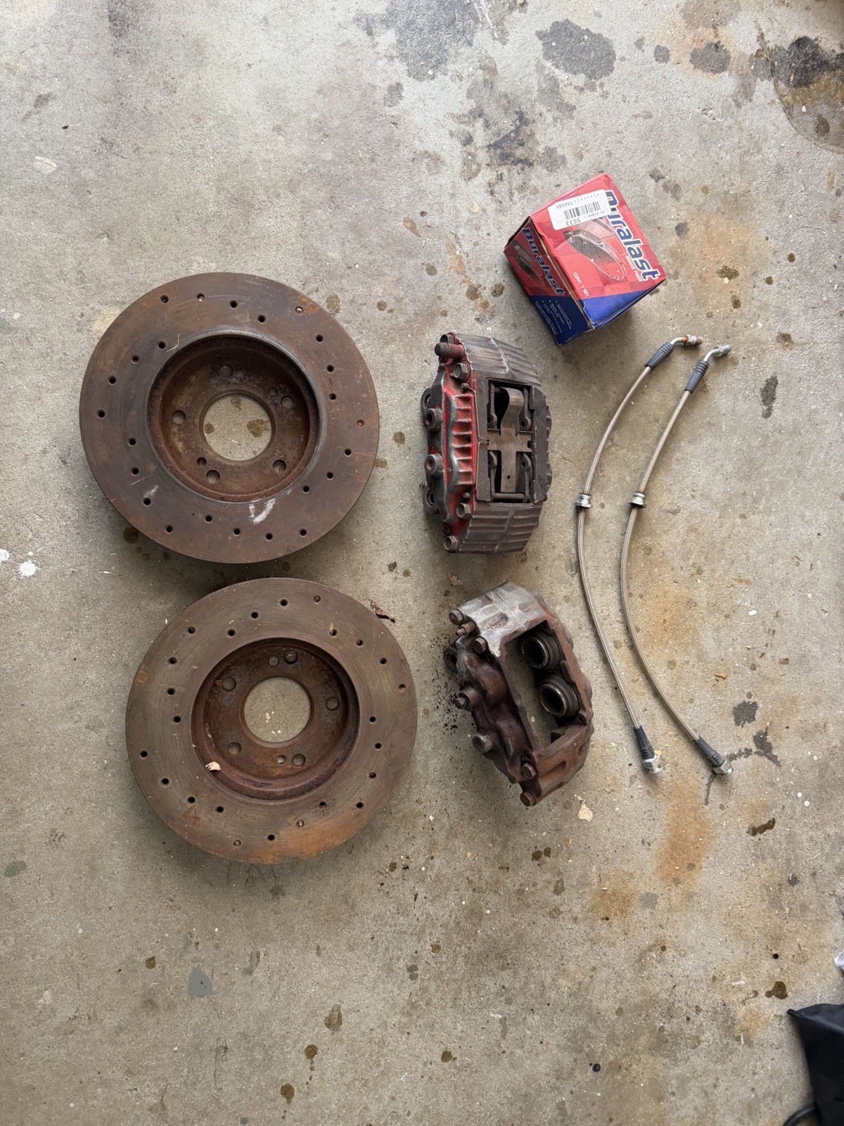 The product is a complete brake kit for a Nissan 300ZX, including brake calipers, rotors, and stainless braided brake hoses. The pads are from Autozone and the rotors are drilled style. This kit provides everything needed for the front brakes of the 300zx or could be used on other Nissans of the vintage, making it easy to upgrade or replace existing brake components for improved performance and safety. It looks like one caliper is aluminum and the other is cast. A fitting is in one of the calipers and I have not tried to remove it. Please feel free to ask for more pictures and all sales are final!