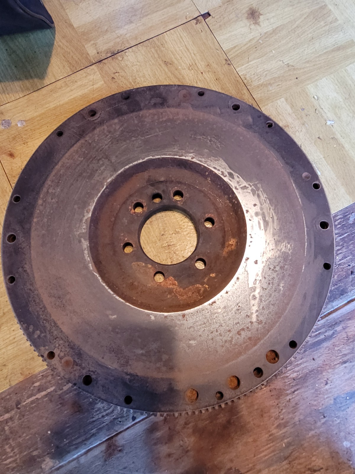 The product is a vintage Chevrolet nodular flywheel with 168 teeth, designed for manual transmission vehicles. This solid flywheel is compatible with GM Chevy Big and Small Block engines, making it suitable for Chevelle, Camaro, and Nova models. The manufacturer part number for this flywheel is 3988795, ensuring authenticity and quality. It is a genuine Chevrolet performance part that is essential for maintaining the transmission and drivetrain system in classic Chevrolet vehicles. One used 3988795 General Motors (GM) 168 tooth nodular iron flywheel. Used in various Chevrolet vehicles, including the Corvette, Camaro, Chevelle, and Nova, primarily from the mid-1950s through the early 1980s. This item is used and fairly rusty, but appears to be in good usable condition with no missing teeth. This item is being sold AS-IS. No returns are accepted.