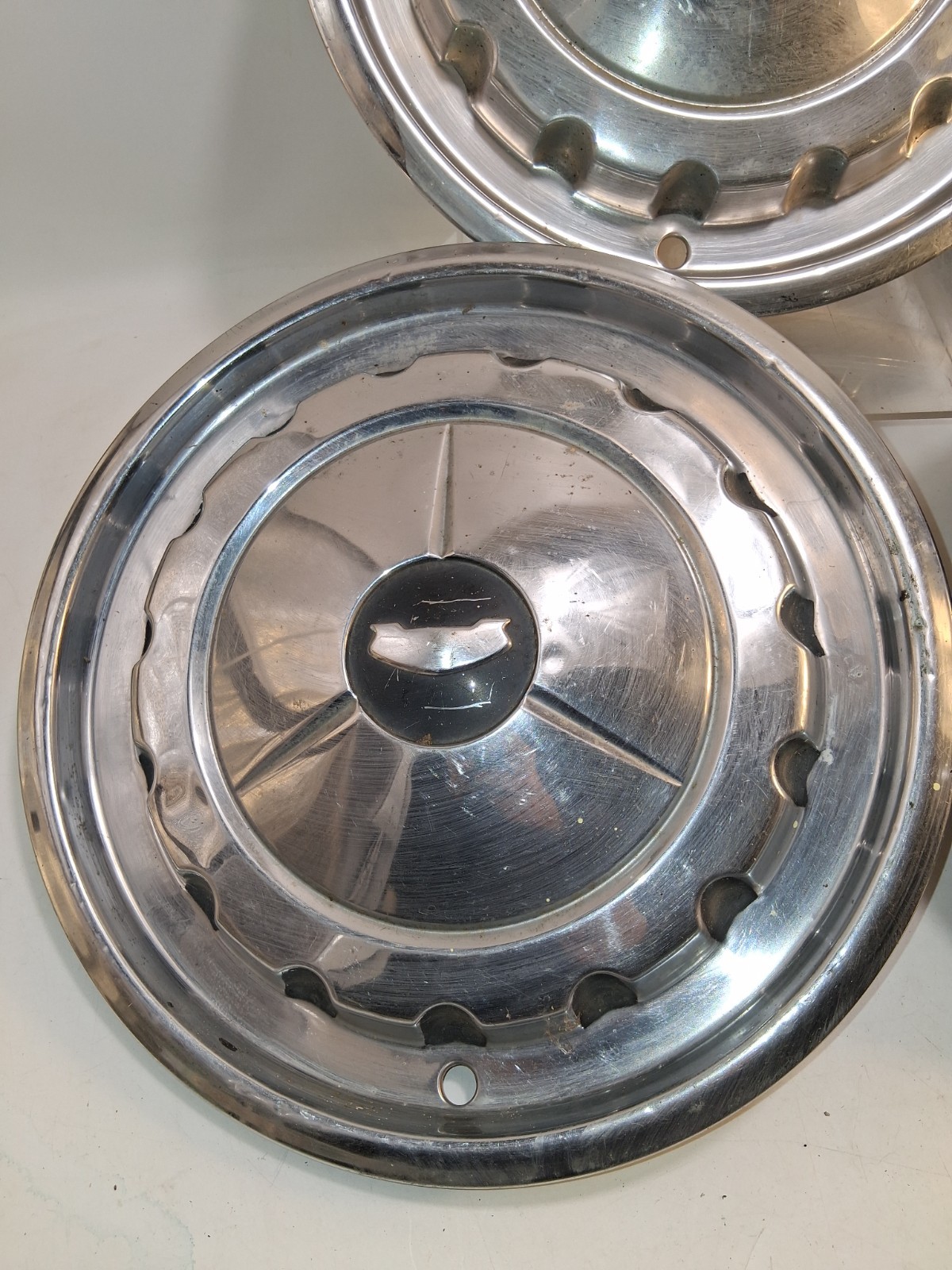 Some scratches and minor dings . Black paint faded off on one. This product is a set of four 1957 Chevrolet Chevy Belair Impala Nomad hubcaps in silver color. Made of chrome material, these vintage parts are easy to install and designed for 14-inch wheels. The hubcaps feature the Chevrolet brand logo and are original equipment manufactured in the United States. These center caps add a classic and stylish touch to your vehicle, making them a desirable choice for Chevy enthusiasts looking to restore or customize their wheels............... We try to source items that are in great shape , unless other wise noted above. This item will be in good used condition with no major defects. All used items will show wear , expect minor marks / wear to fabric and friction surfaces. All textiles will have odors from previous owners , storage , thrift stores ect.