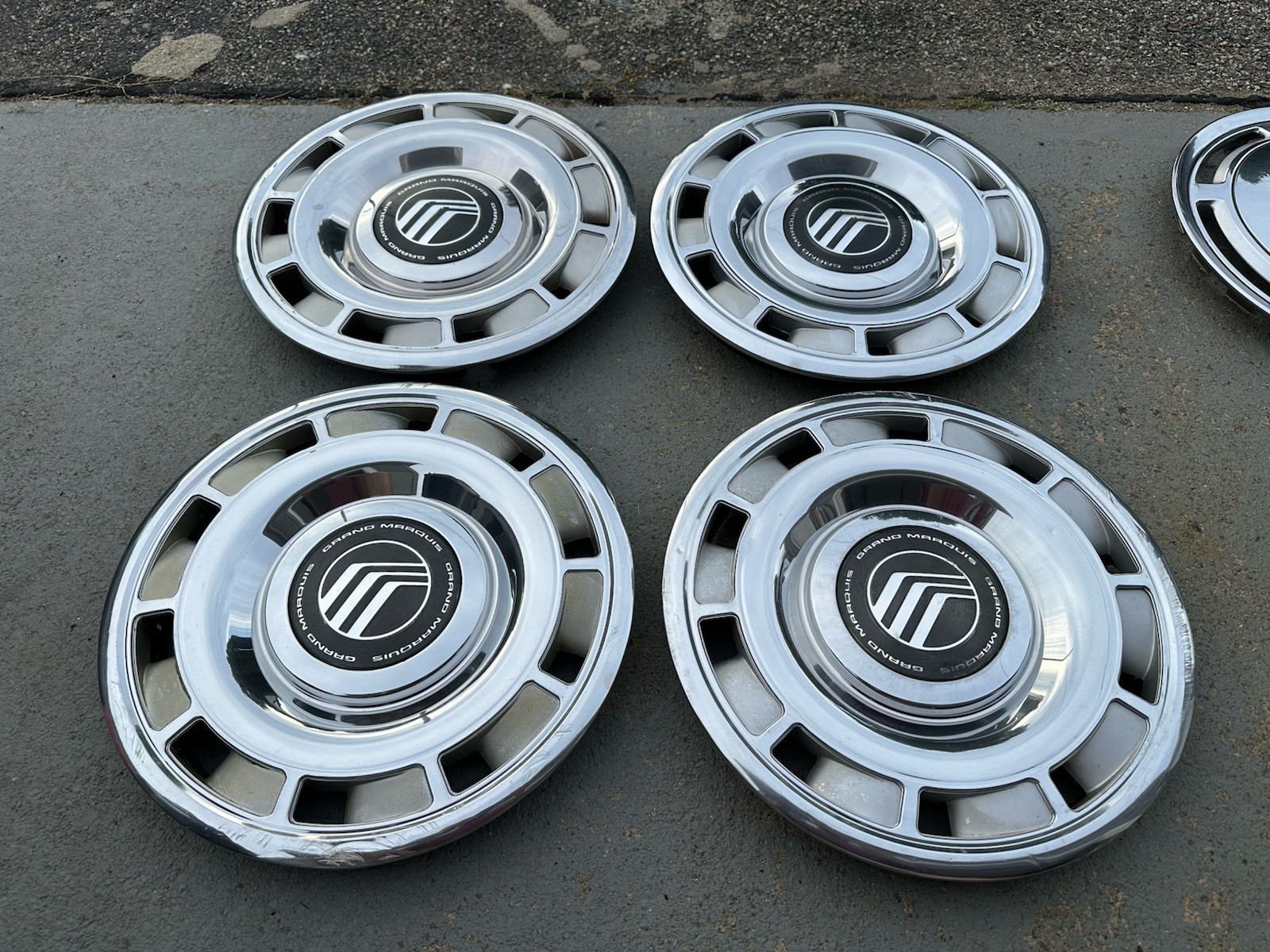 PLEASE REVIEW ALL PHOTOS AND THE DETAILED DESCRIPTION PRIOR TO PURCHASE. This is a used part. Normal age related fading, scratches and other imperfections are present unless otherwise noted. More details and specifics are detailed below. One set of grand Marquis hubcap for 15” steel wheels used on 88-91 model year cars but will fit most Marquis with standard 15” steel wheels and rear wheel drive All 4 are in good condition each has some dings scratches and curb damage from age and use Please review all photos