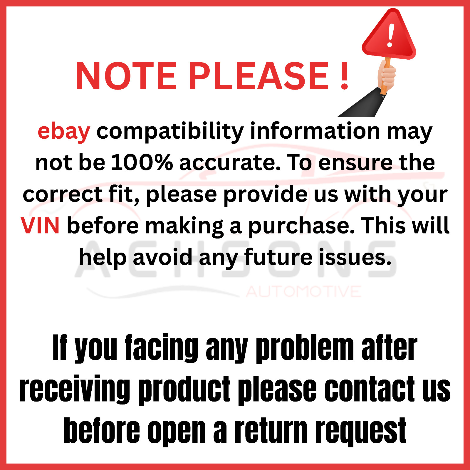 **Note**: **It is the buyer's responsibility to check the compatibility of the part number.** **If you are not sure if this item will fit your vehicle, please message us your vehicle's VIN number and we will check for you.** **Return Policy:** **We accept returns if the item you received is defective or in a non-working condition. When an item is returned, it will be inspected and only then will a decision be made whether it is eligible for a refund. All returns must be made and accepted within 30 days of the item being received by the customer. If the item is non-functional or if it differs substantially from the description, please contact us so arrangements can be made for a return. We will also cover the shipping costs back to us for those items. We accept product returns for incorrect or unwanted parts** **Warranty**: **We offer a limited warranty for the 30 days return period; we advise you to use the 30 days to install and check for the functionality of this part. Item must be returned in its original condition in order to qualify for a warranty. Any attempt to disassemble the part will void the warranty.** **Shipping**: **The complete address will be provided after completing the purchase. Handling time for shipping is usually 2 business days. Our working days are Sunday to Thursday. YOUR ORDER WILL SHIP WITHIN 2 DAYS OF CLEARED PAYMENT. Delivery time frame is between 5-7 days for US Only. For other payment methods please contact us**.