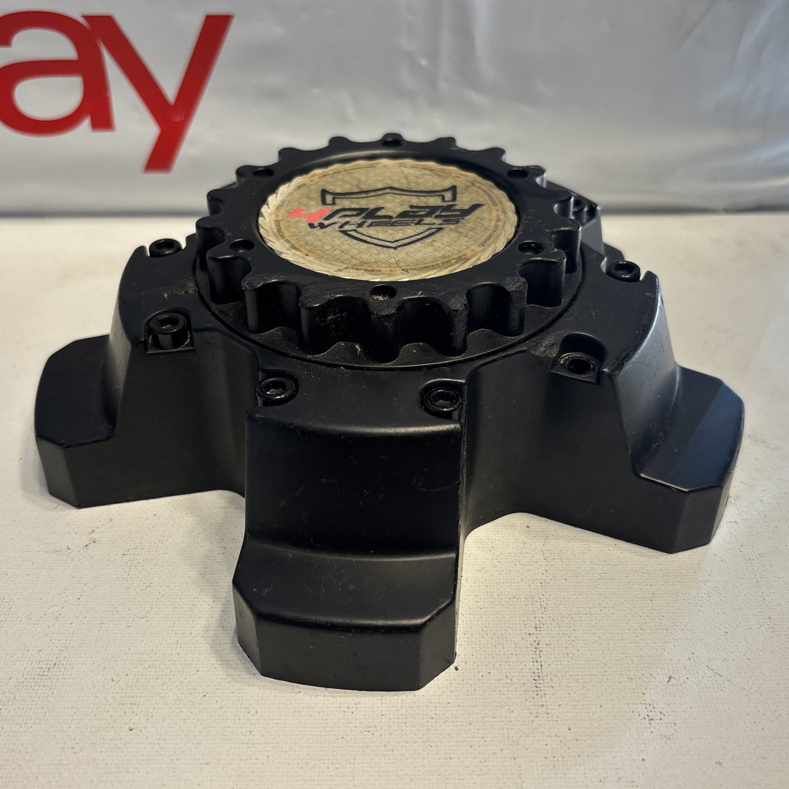 **Center cap is used and has cosmetic damage.** **Center of the** **center** **cap has been lightly applied with acrylic pen to enhance appearance of lettering.** **Please review all pictures before purchasing,** **what do** **you see is what you get** **. Does not come with any mounting hardware (screws/bolts).**